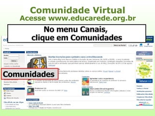 O documento fornece instruções sobre como se inscrever na comunidade virtual "EducaRede - Minha Terra 2008" no portal EducaRede, explicando que os usuários não cadastrados precisam preencher um formulário de inscrição e os usuários cadastrados podem diretamente se inscrever na comunidade. Após a inscrição, os usuários poderão interagir em ferramentas como blog e mensagens.