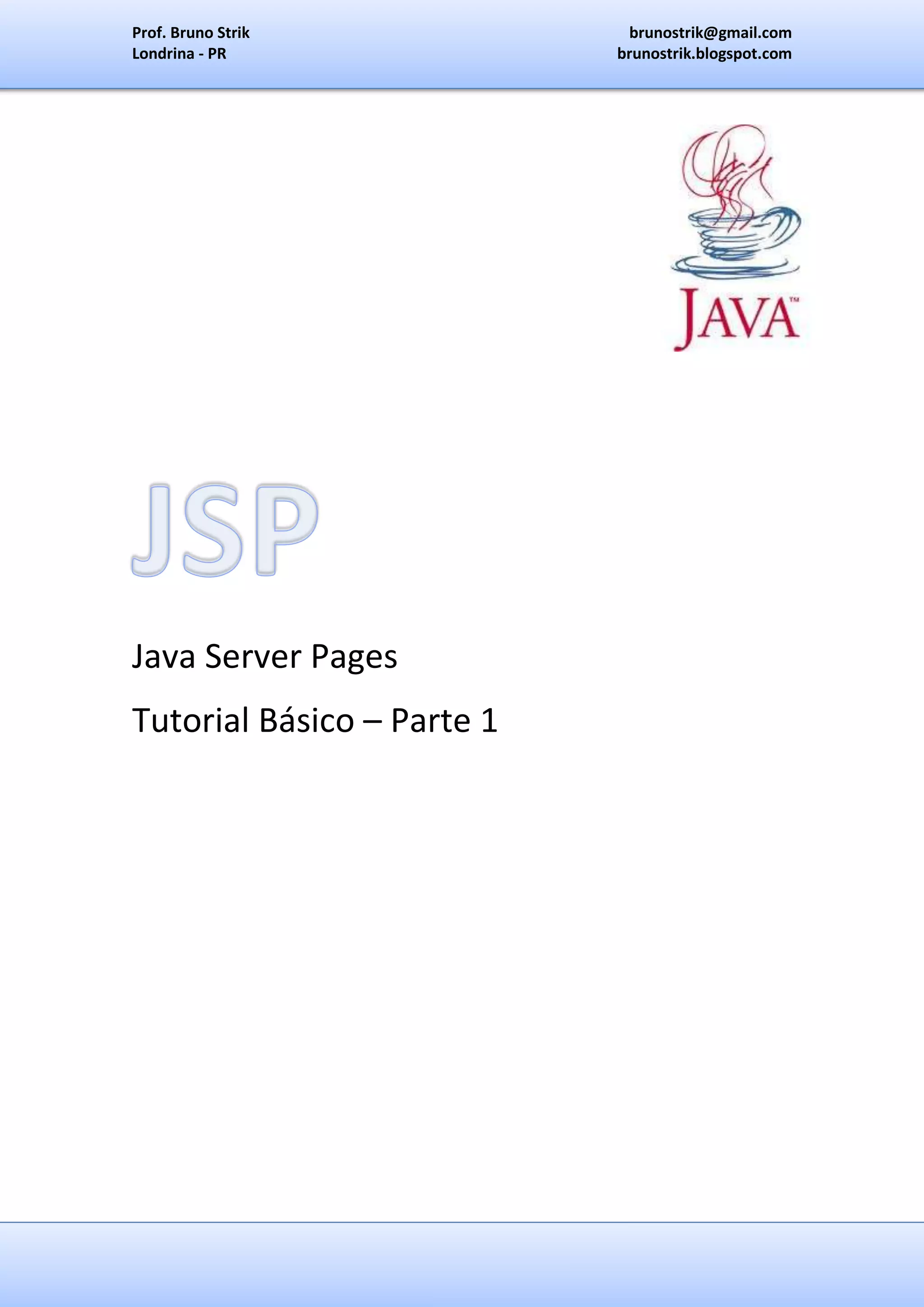 Prof. Bruno Strik brunostrik@gmail.com Londrina - PR brunostrik.blogspot.com Introdução Os servlets são muito eficientes, mas sua programação é lenta e difícil, e por se tratar de código Java, a maioria dos designers não consegue interpretar. Quando o JSP foi desenvolvido, a Sun Microsystems (Agora Oracle) reuniu vários programadores, designers, especialistas em redes, padrões de projeto e focou na criação de algo que seria rápido, funcional, seguindo os padrões da web, e entendido por designers com um básico conhecimento de programação e também por programadores especialistas. Nesta idéia nasceu o JSP, uma linguagem robusta e eficiente, com o propósito de substituir os servlets. Este tutorial é para quem já conhece programação java e servlets. Se você ainda não os conhece procure um tutorial em brunostrik.blogspot.com (DNS em 01-2010).