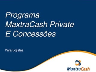 O documento apresenta o programa MaxtraCash Private, que oferece ferramentas como cartões personalizados, cashback para clientes em compras, e divulgação no portal MaxtraStore para lojistas. O programa tem como objetivo fidelizar clientes e aumentar vendas por meio de recompensas e identidade visual da empresa no cartão.