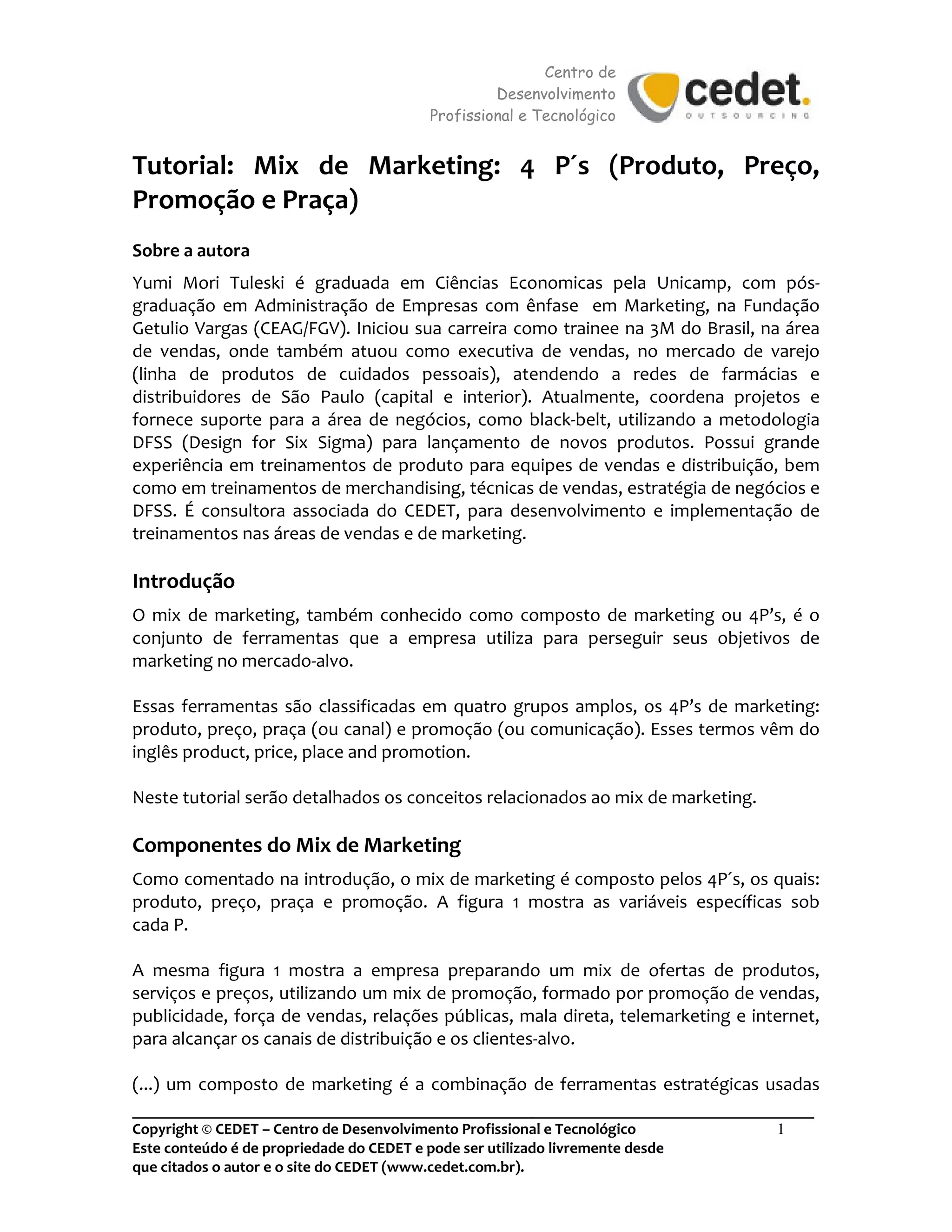 O documento discute os conceitos do mix de marketing, conhecido como 4P's, que inclui produto, preço, praça e promoção. A autora detalha cada um dos 4P's, definindo seus componentes e como as empresas podem utilizá-los em suas estratégias de marketing.