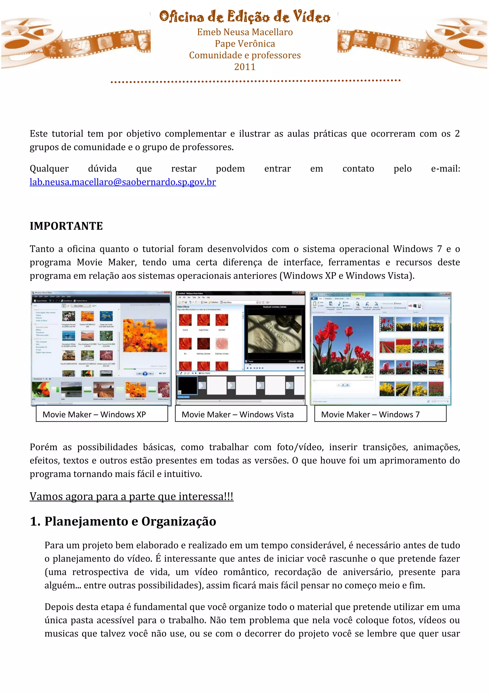 Este documento fornece instruções sobre como usar o programa Windows Movie Maker para editar vídeos. Ele explica como organizar arquivos, criar um projeto, adicionar fotos, vídeos e música, aplicar transições e efeitos, e inserir títulos e legendas.