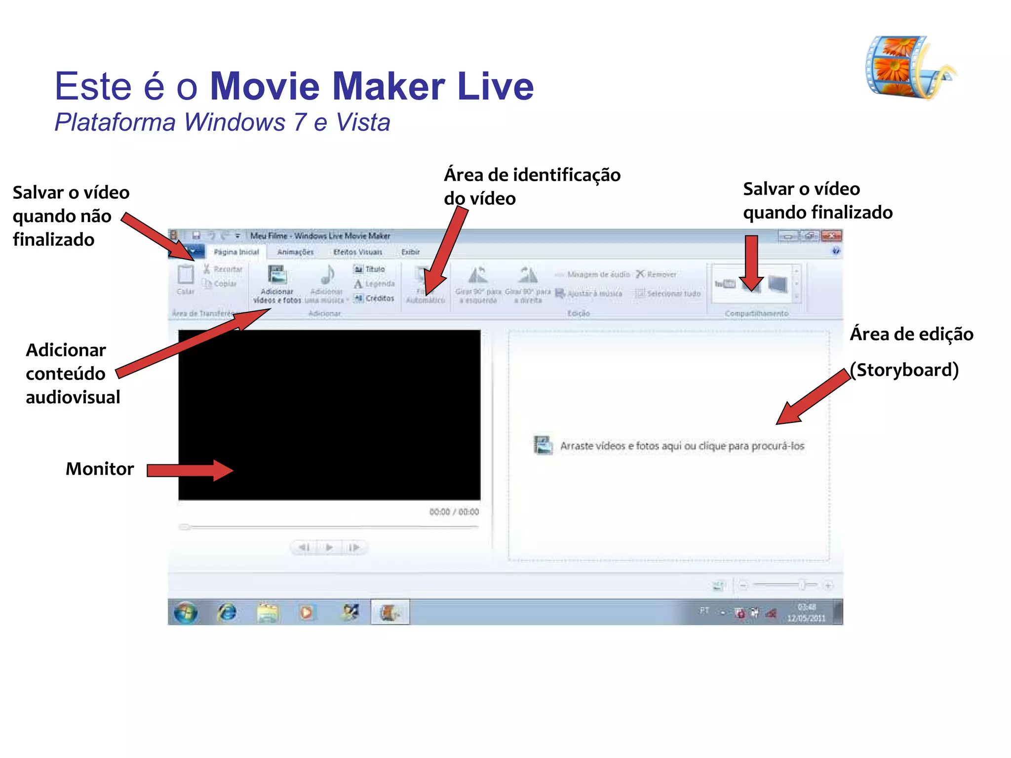 Este documento fornece um tutorial sobre como usar o Movie Maker Live para editar vídeos e áudios. Ele explica como adicionar fotos, vídeos e música; editar vídeos com cortes e mixagens; adicionar títulos e legendas; e aplicar efeitos de transição. O tutorial também mostra como salvar e organizar projetos.
