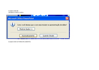 O documento fornece instruções para adicionar música a uma apresentação de slides. Ele explica como clicar em "Automaticamente" para abrir um ícone de som e como marcar opções como "Efeito", "Começo" e "Depois de" para definir a música para tocar em determinados slides.