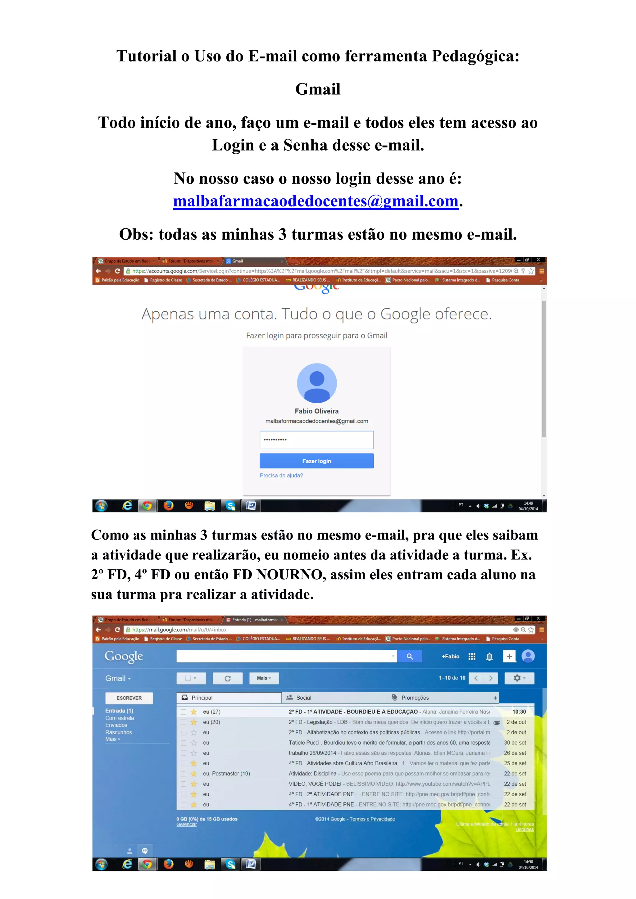 O documento descreve como um professor usa um e-mail compartilhado para fornecer atividades para três turmas diferentes. Ele nomeia a turma no assunto do e-mail para que os alunos saibam qual atividade realizar. As respostas ficam na ordem de postagem para evitar plágio.