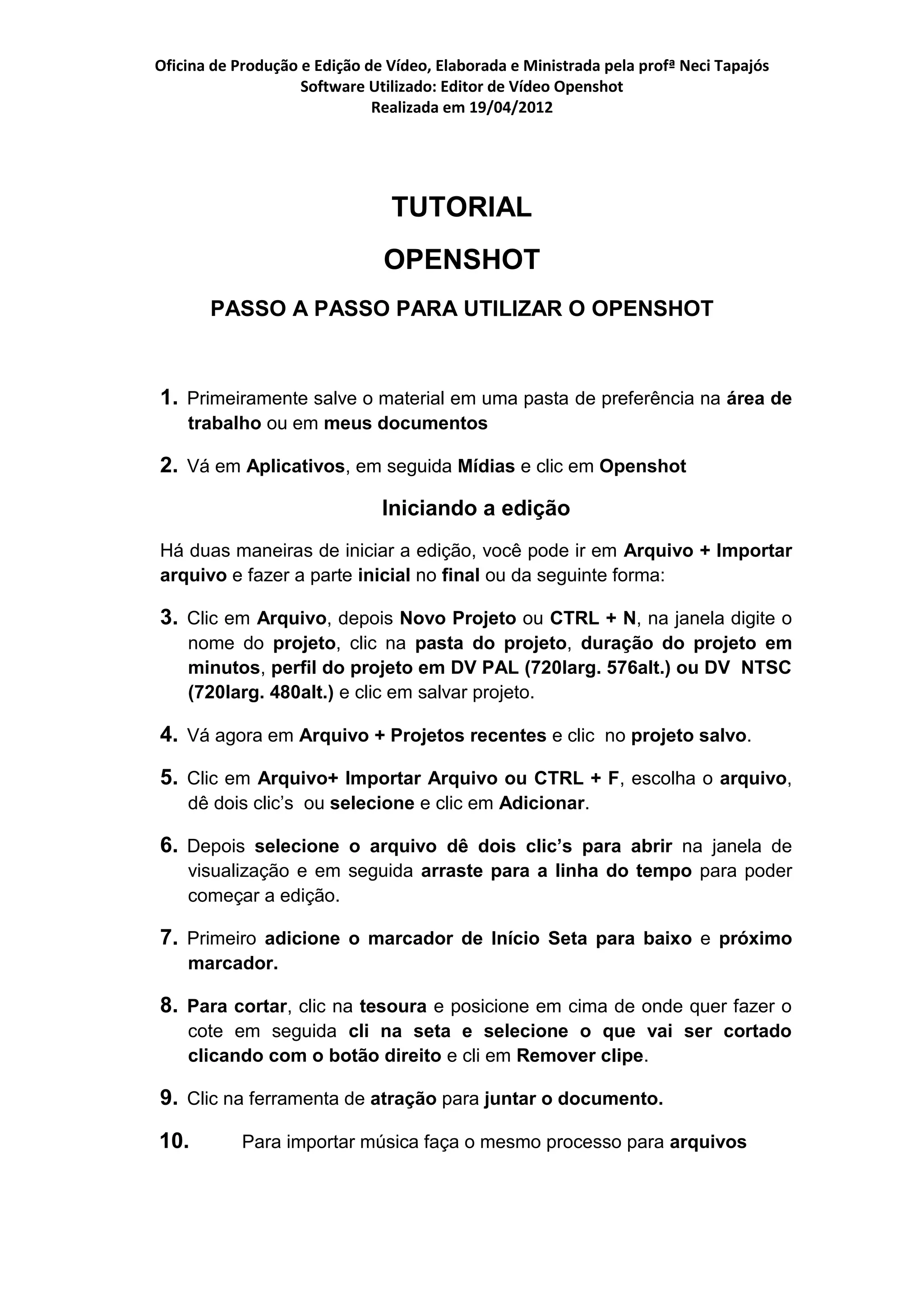 O documento é um tutorial de edição de vídeo utilizando o software OpenShot, elaborado pela profa Neci Tapajós. Ele fornece um passo a passo detalhado para iniciar um projeto, importar arquivos, cortar e adicionar música, títulos e créditos, além de exportar o vídeo finalizado. A oficina foi realizada em 19/04/2012 e oferece uma abordagem prática para a produção de vídeos.
