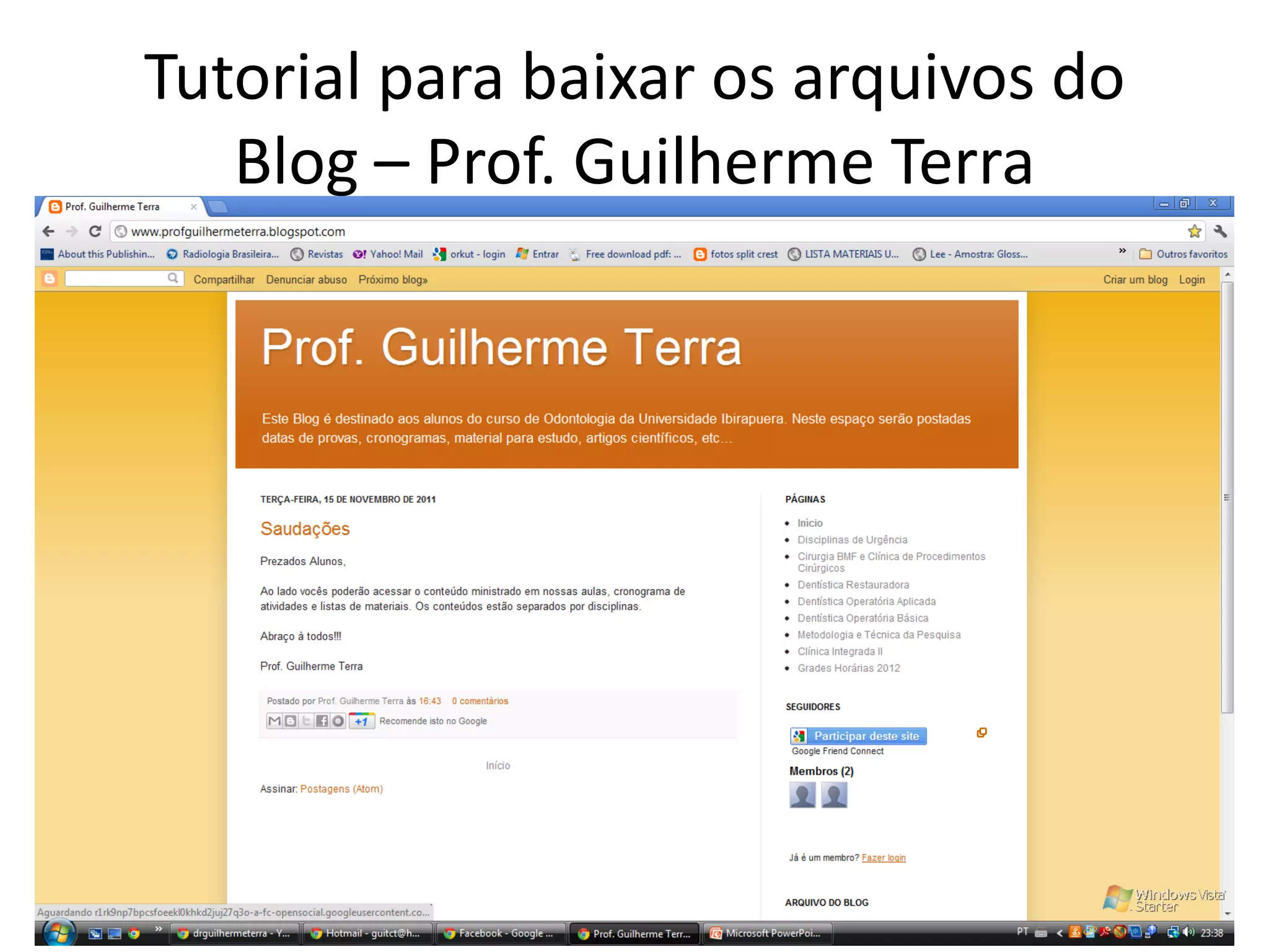 Abra a página do blog do Prof. Guilherme Terra, clique na disciplina e arquivo desejado para baixá-lo. O arquivo abrirá no Slideshare, onde você deverá fazer login via Facebook ou criar uma conta no Slideshare para realizar o download. Nas próximas vezes, basta fazer login diretamente com seus dados.