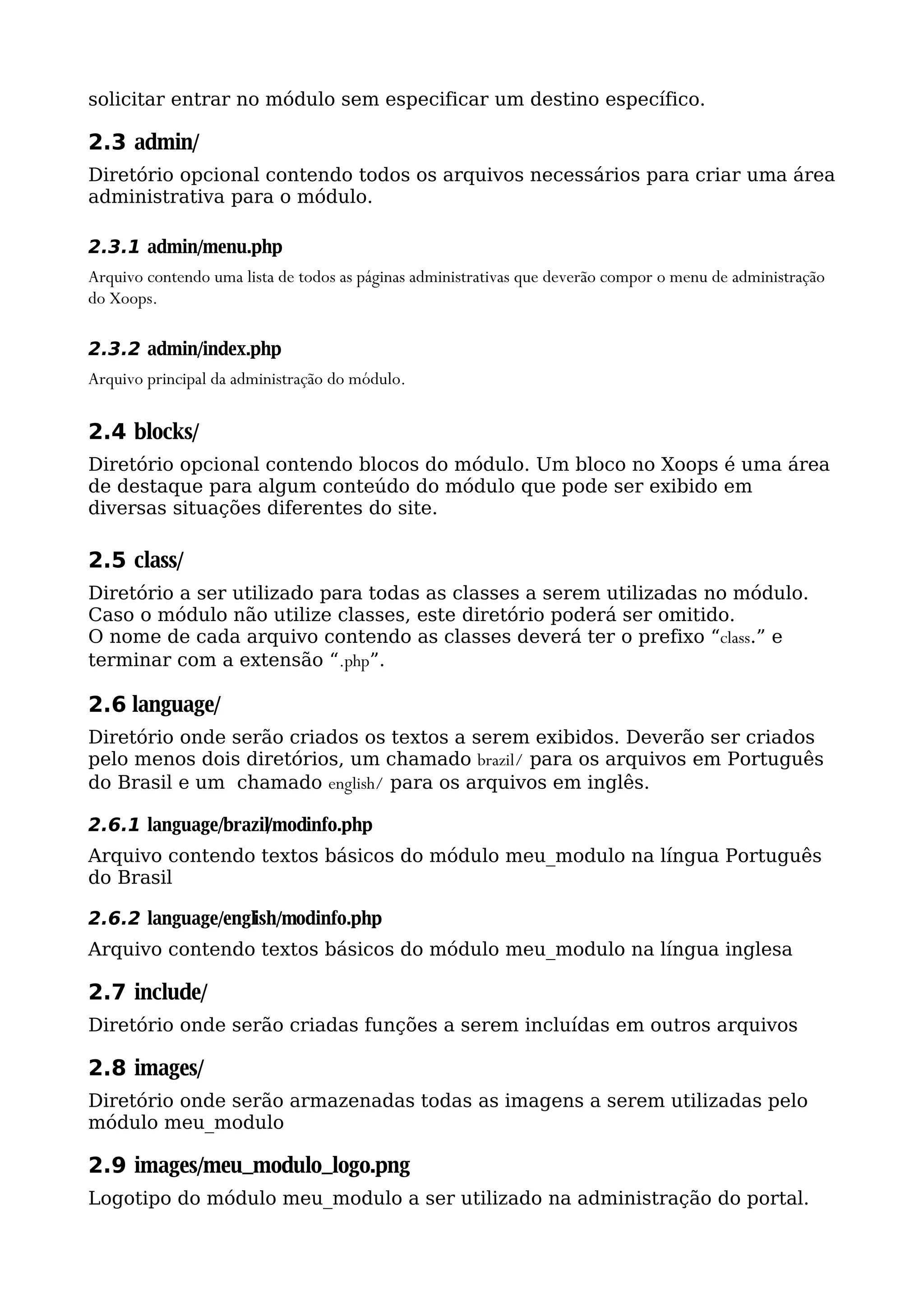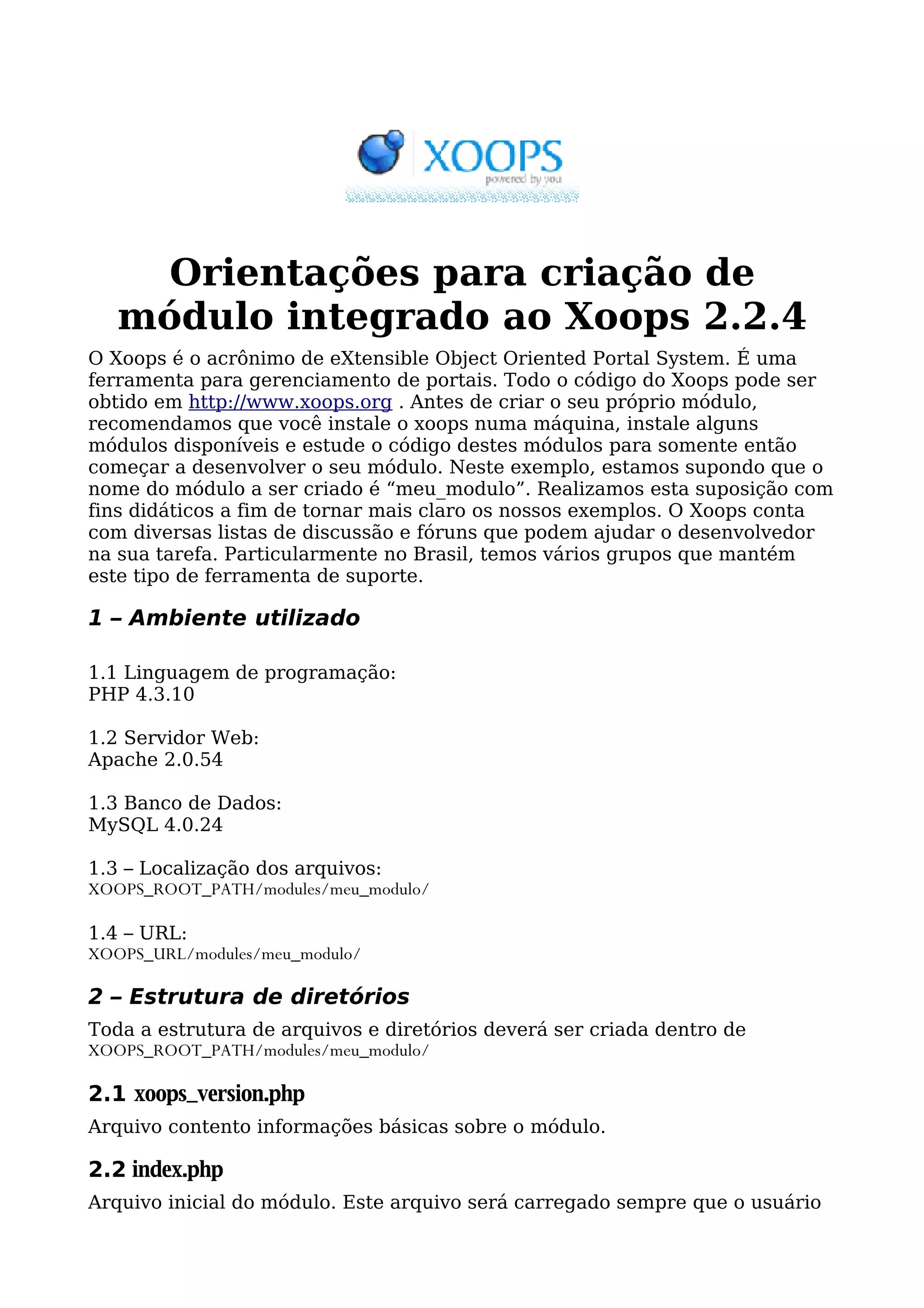 O documento fornece orientações para criação de um módulo integrado ao sistema Xoops 2.2.4, descrevendo a estrutura de diretórios, arquivos e informações necessárias no arquivo xoops_version.php para instalação e configuração do módulo.