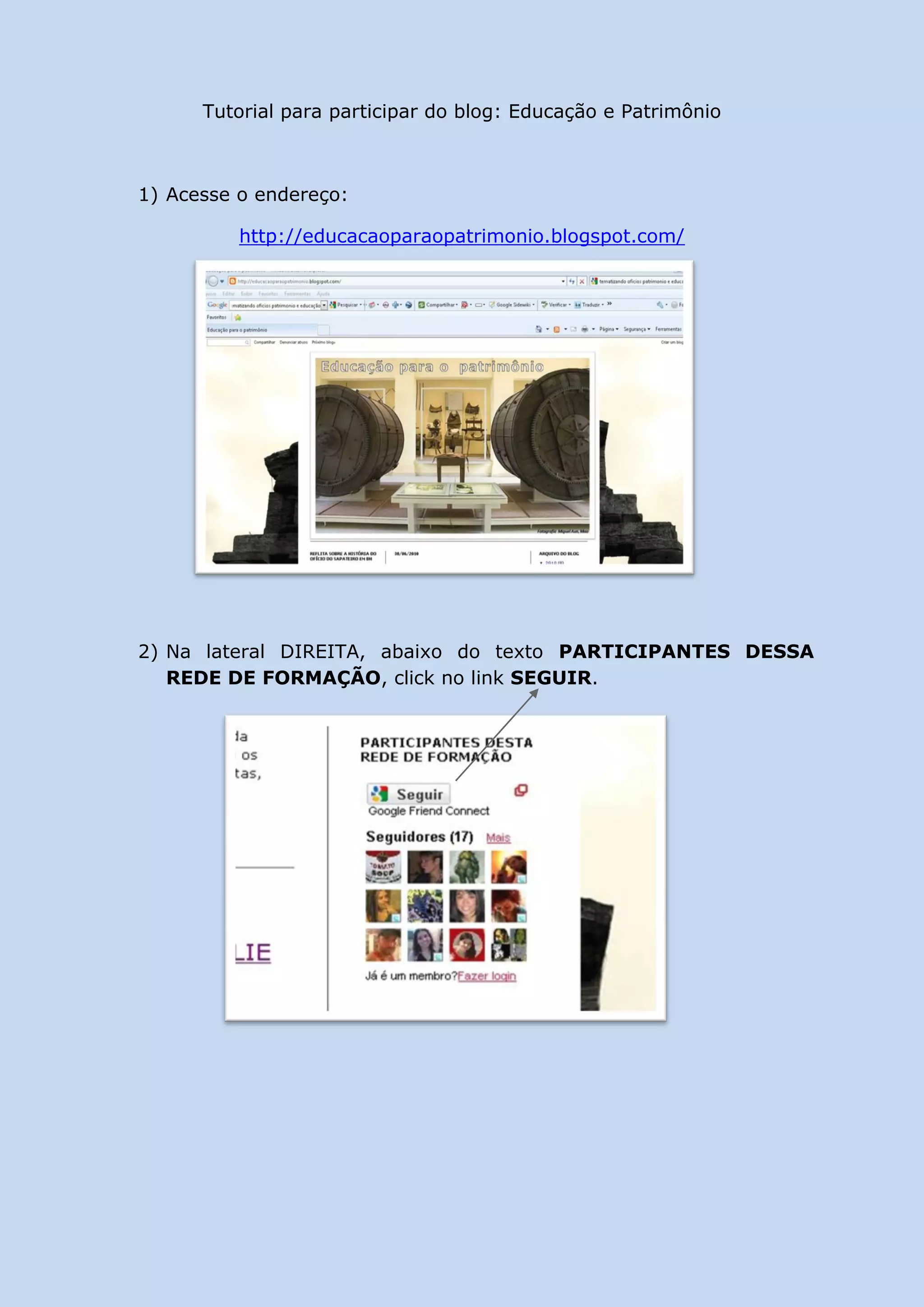 O documento fornece instruções em 6 passos para participar de um blog sobre educação e patrimônio, incluindo acessar o endereço do blog, clicar no link "Seguir", fazer login com sua conta de e-mail, personalizar suas configurações e concluir o processo.
