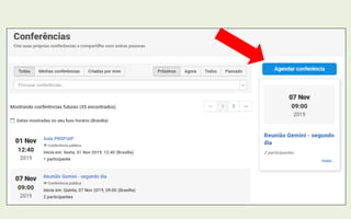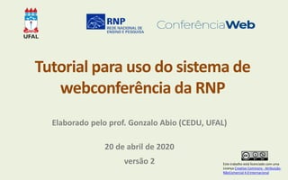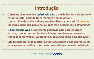 Este tutorial, elaborado pelo professor Gonzalo Abio, fornece orientações sobre como utilizar o sistema de webconferência da RNP, permitindo reuniões e aulas virtuais com até 75 participantes. O documento cobre desde o acesso ao sistema até dicas para a realização eficaz de aulas virtuais, incluindo a gestão de áudio e vídeo, interações e uso de ferramentas colaborativas. Destaca também a importância de preparar o material e criar um ambiente positivo para os alunos durante as sessões online.