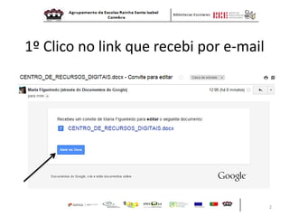 Projeto INFOINCLUSÃO na Biblioteca e com a comunidade tinha como objetivo promover práticas de aprendizagem no contexto de uma escola TEIP através da partilha de ficheiros no Google Drive. O tutorial ensinava como receber um link por e-mail, partilhar o ficheiro no Drive, inserir emails de outras pessoas para ter acesso e autorizá-las a editar.