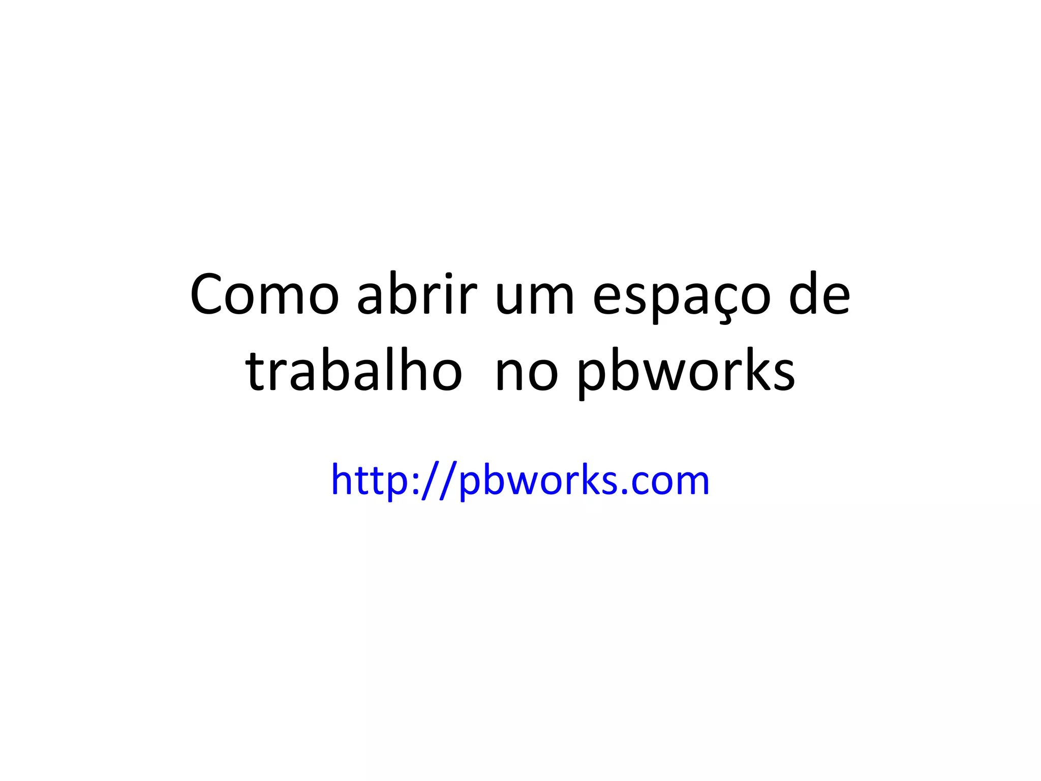 O documento fornece instruções em 3 frases ou menos para cada etapa de como abrir um espaço de trabalho no pbworks: 1) Clicar para assinalar como educador e abrir um pbworks gratuito; 2) Escolher um endereço único e memorizável; 3) Fornecer email e senha para confirmar a conta.