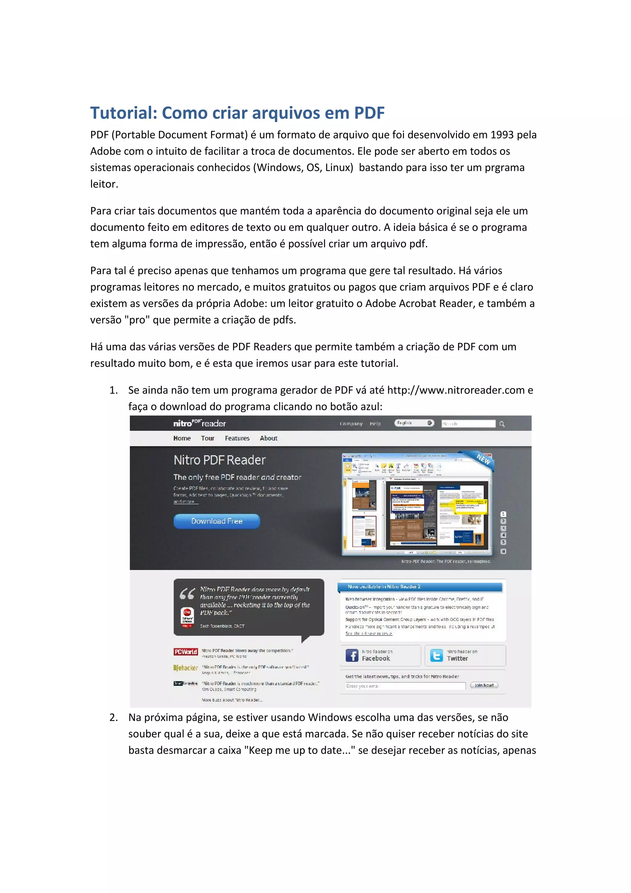 O documento explica como criar arquivos em PDF usando o programa Nitro PDF Reader em 7 passos: 1) Fazer download do programa, 2) Instalar o programa, 3) O programa adiciona uma nova opção de impressora, 4) Usar esta opção de impressora para criar PDFs, 5) Fornecer um nome para o arquivo PDF, 6) O arquivo PDF é salvo.