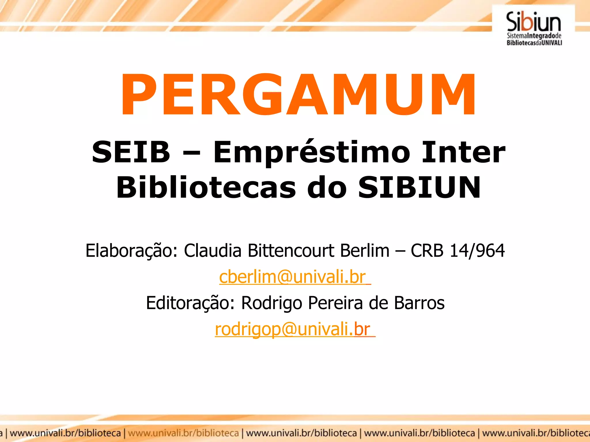 Este documento fornece instruções sobre como solicitar materiais de outras bibliotecas participantes do Sistema Integrado de Bibliotecas da UNIVALI (SIBIUN) através do serviço de empréstimo interbibliotecas (SEIB). Os leitores devem pesquisar o item online, verificar sua disponibilidade em outras bibliotecas e preencher um formulário para solicitar o empréstimo.