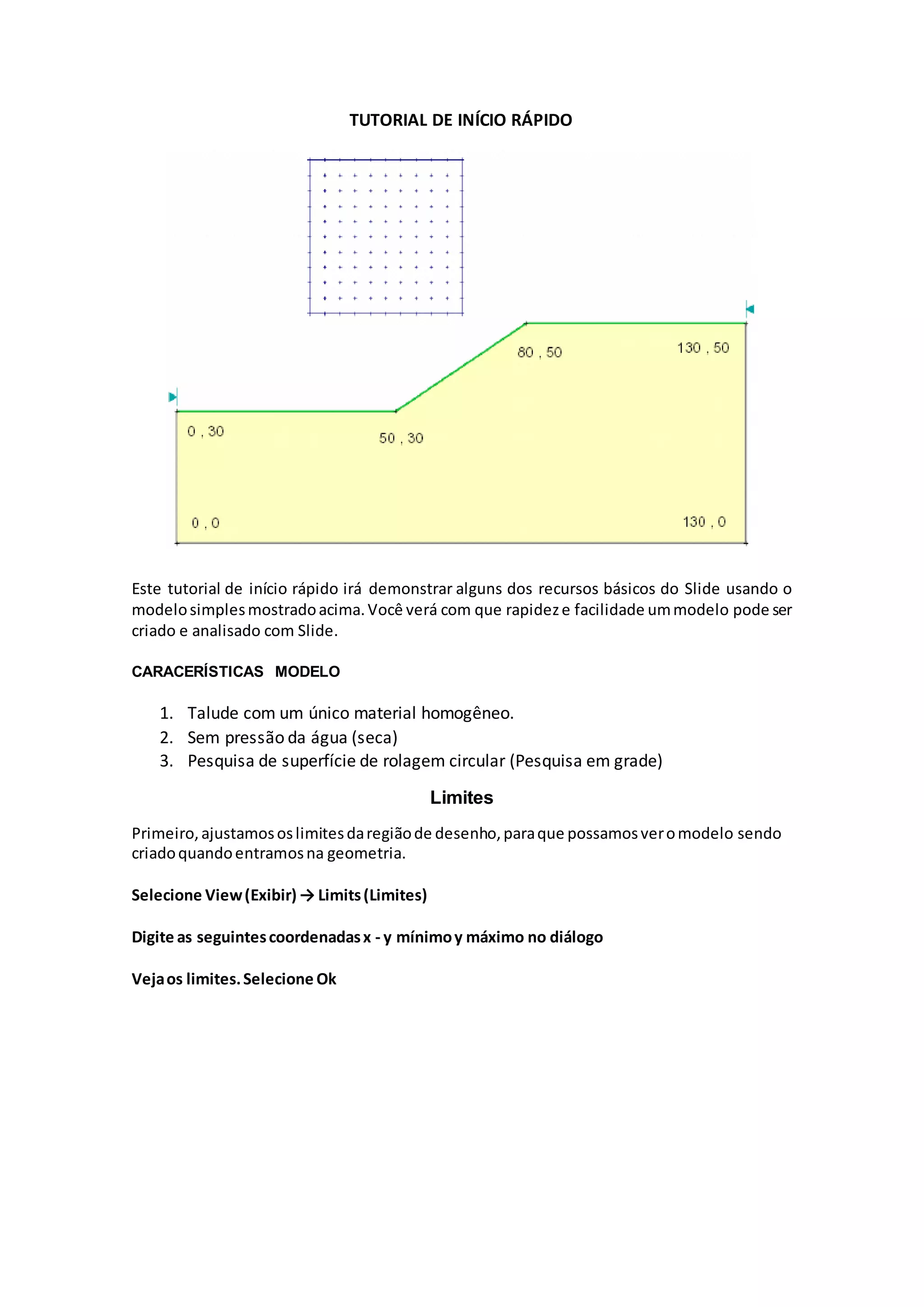 1) O documento apresenta um tutorial rápido sobre como usar o software Slide para modelar e analisar a estabilidade de taludes. 2) O tutorial demonstra como criar um modelo simples com um único material homogêneo, definir propriedades, configurações do projeto e realizar uma pesquisa de superfície crítica circular. 3) Os resultados da análise são interpretados para exibir a superfície de deslizamento crítica global e contornos de fator de segurança na grade de pesquisa.