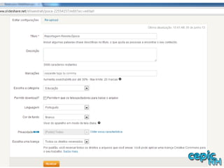 O documento fornece um tutorial sobre como usar a ferramenta SlideShare para fazer upload e incorporar apresentações em formato .ppt ou .pdf em blogs. Ele explica o processo de criar uma conta, fazer o upload de arquivos, editar informações, copiar o código de incorporação e colá-lo em uma postagem do blog para publicar a apresentação.