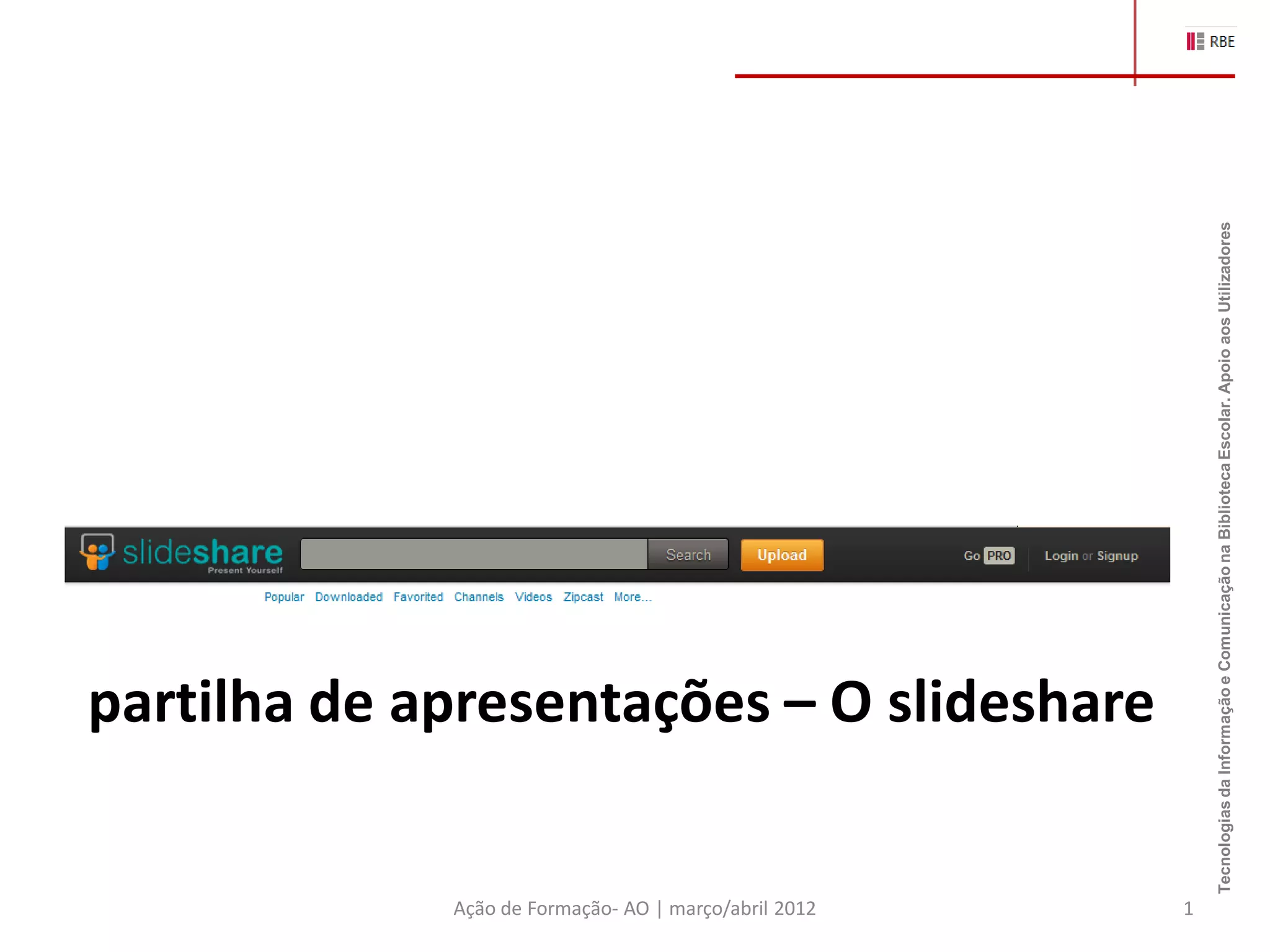 O documento descreve como utilizar o SlideShare, uma ferramenta online para partilhar apresentações. Explica como fazer o registo, carregar apresentações, editá-las, copiar o código embed, partilhá-las em blogs, e configurar as definições de partilha.