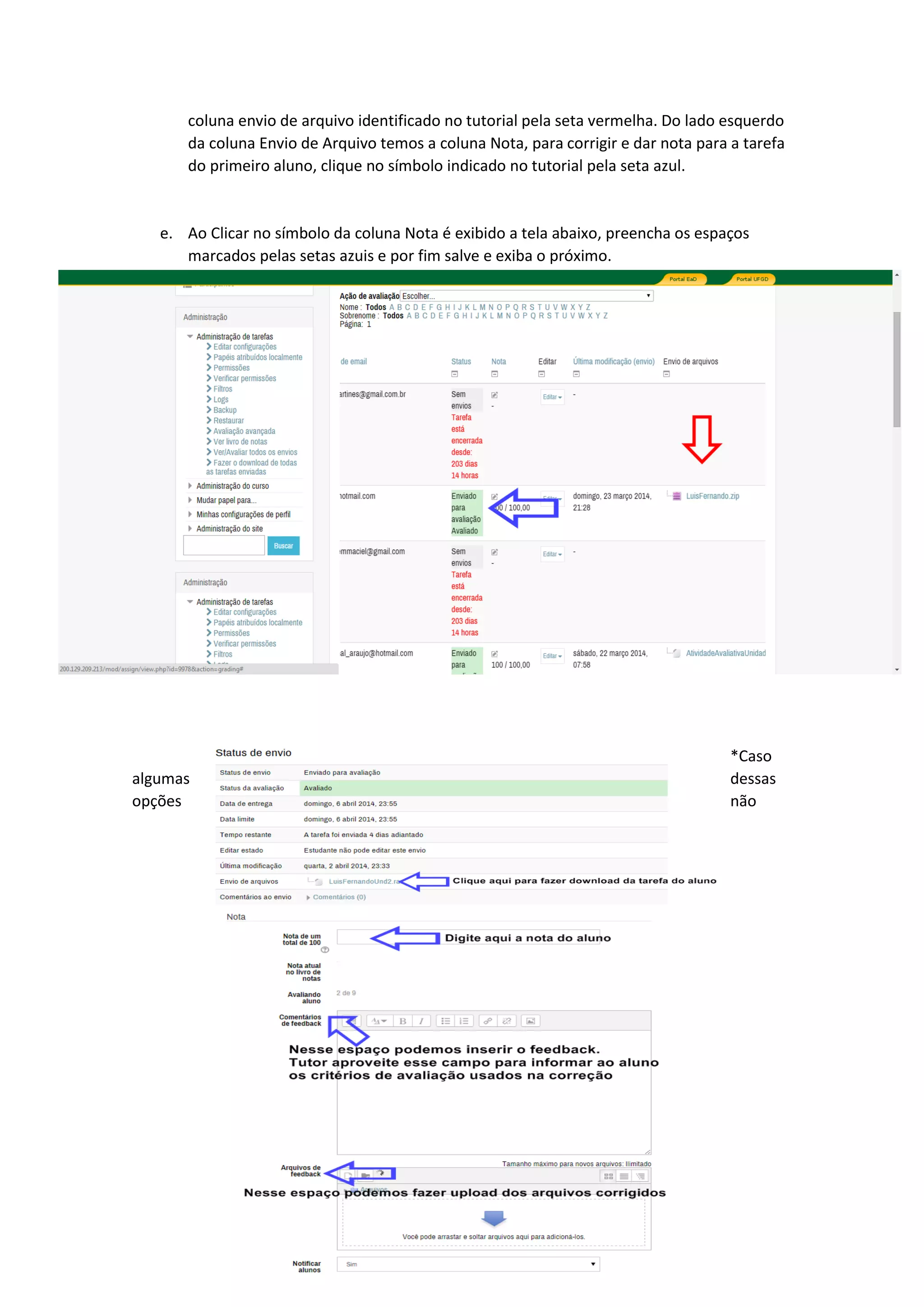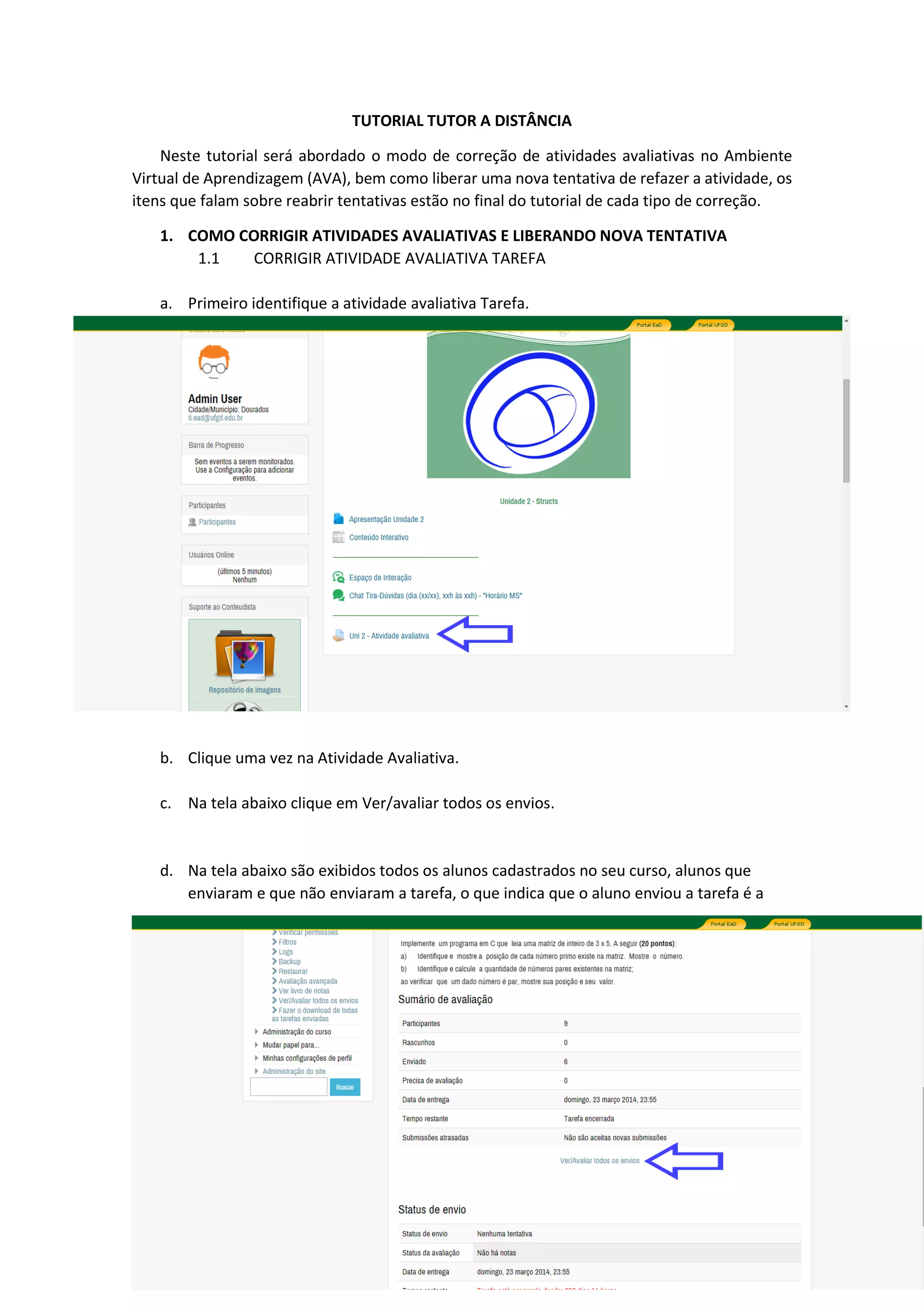 Este documento fornece instruções sobre como corrigir atividades avaliativas e liberar novas tentativas no Ambiente Virtual de Aprendizagem. Ele explica como corrigir tarefas e questionários, dar notas, e permitir que os alunos façam novas tentativas. Também descreve como acessar o relatório de notas no sistema.