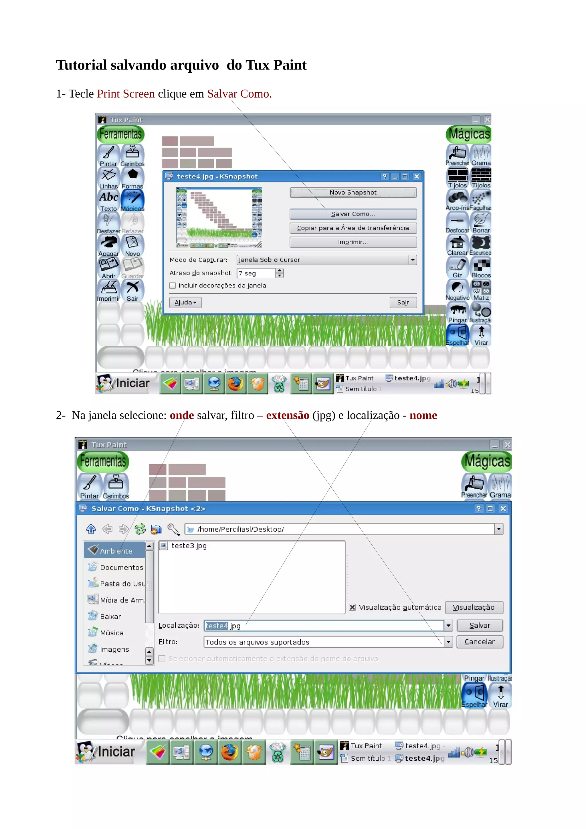 Para salvar uma imagem do Tux Paint, pressione Print Screen e clique em Salvar Como para escolher onde e como salvar o arquivo. Em seguida, insira a imagem no arquivo e use a opção de corte demarcado para remover as bordas da imagem.