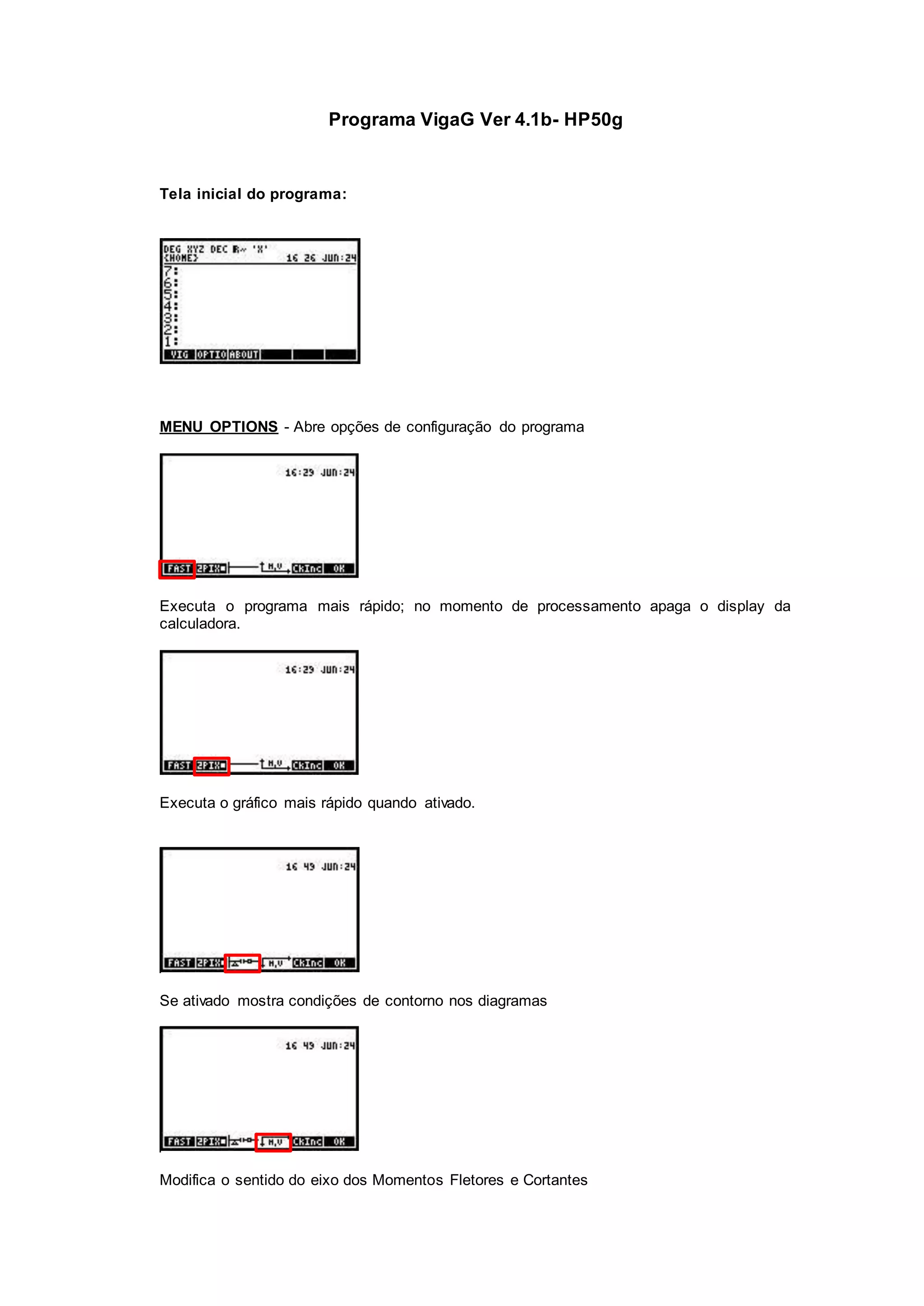 O documento descreve as funcionalidades de um programa para análise de vigas chamado VigaG Ver 4.1b para calculadoras HP50g. O programa permite modelar vigas com diferentes condições de apoio, cargas e propriedades, calcular diagramas de esforços e deformações, e salvar e carregar arquivos de projetos. O usuário insere dados geométricos e mecânicos da viga, define condições de contorno e cargas, e pode visualizar e analisar os resultados dos cálculos estruturais.