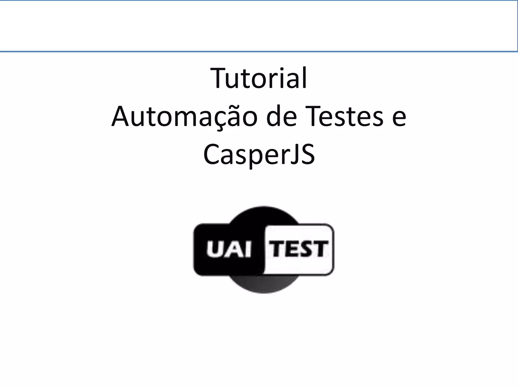 O documento apresenta um tutorial sobre automação de testes com a ferramenta CasperJS. Aborda conceitos como visão sobre automação de testes, processo de automação, manipulação de elementos na página e características e uso da ferramenta CasperJS.