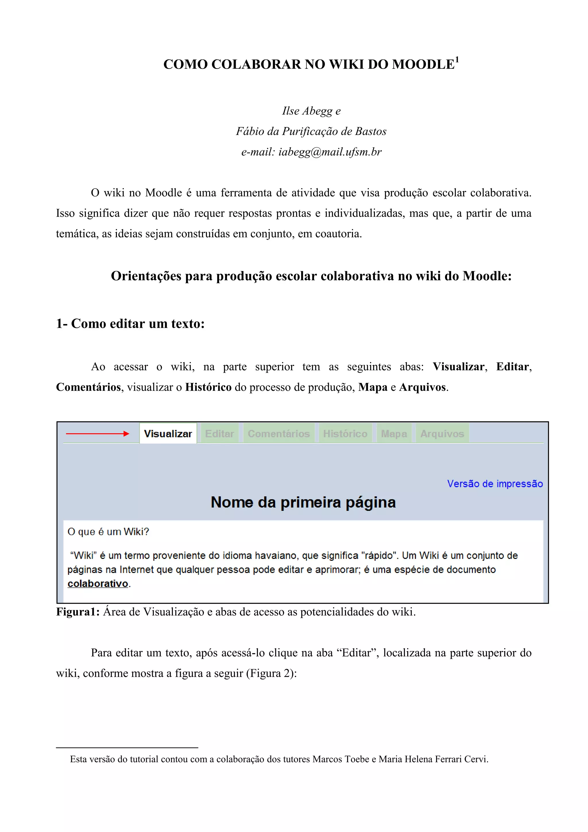 Este documento fornece instruções sobre como colaborar no wiki do Moodle, incluindo como editar textos, inserir imagens, criar links internos e externos, adicionar tabelas e acompanhar as contribuições de cada colaborador. Orienta os usuários a não apagarem texto existente e a usarem a ferramenta de histórico para ver as edições feitas.
