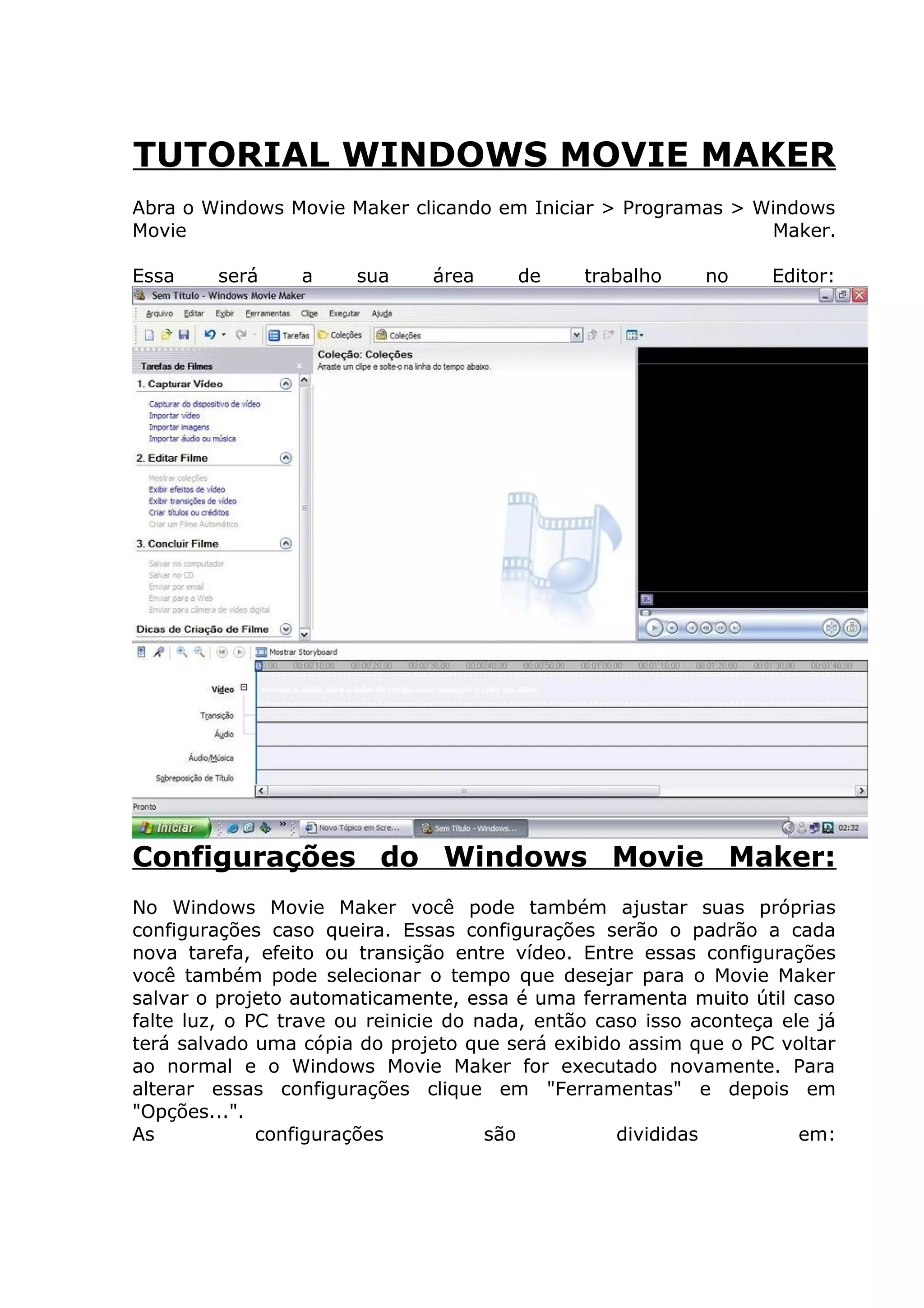 O documento fornece instruções passo a passo sobre como usar o Windows Movie Maker, incluindo como abri-lo, importar vídeos, imagens e música, editar o conteúdo, adicionar efeitos e transições, e criar títulos e créditos.