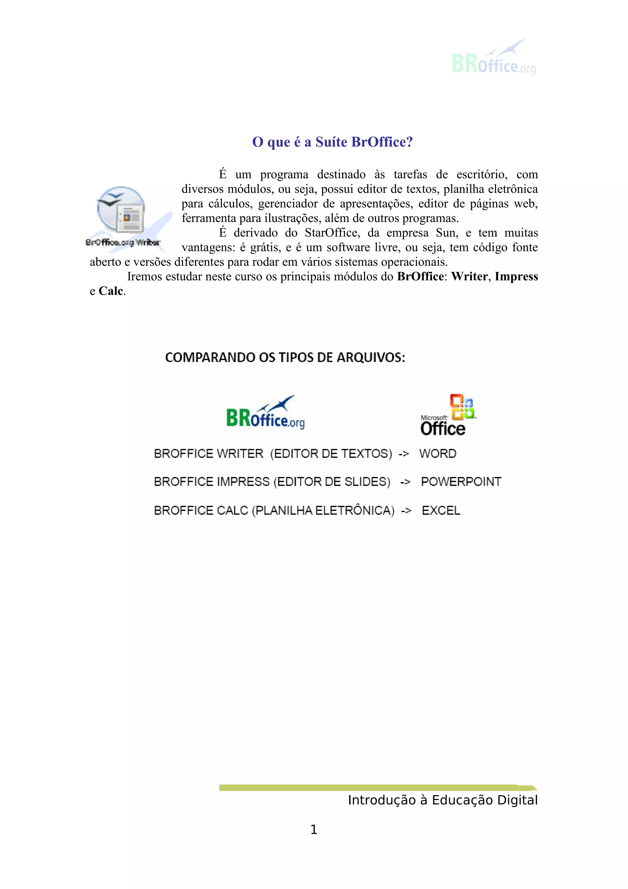 O documento fornece uma introdução ao BrOffice, incluindo seus principais módulos como Writer, Impress e Calc. Ele explica como formatar textos no Writer, inserindo figuras, tabelas, planos de fundo e sons. Também mostra como salvar, abrir, imprimir e fechar documentos no Writer.