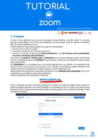 Este documento fornece um tutorial sobre como usar a plataforma Zoom, incluindo como criar e participar em reuniões, aulas e conferências online. Explica como registrar uma conta, agendar uma reunião, iniciar e participar em chamadas, compartilhar telas e usar outras ferramentas durante as sessões.
