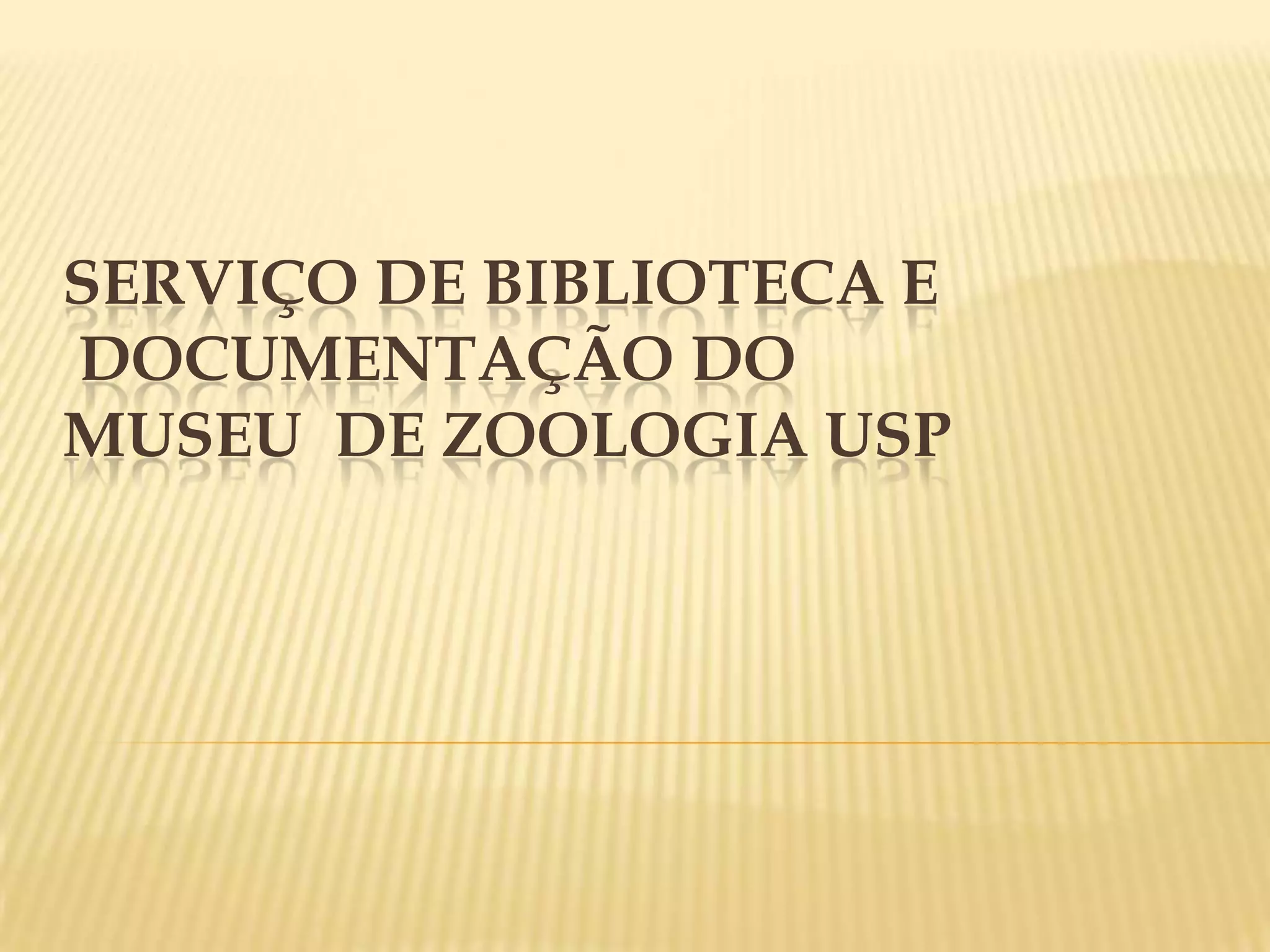 Este documento descreve os serviços e recursos da biblioteca do Museu de Zoologia da USP, incluindo sua equipe, acervo de mais de 115 mil itens, serviços de referência online e física, processamento de materiais, e intercâmbio de publicações com outras instituições.