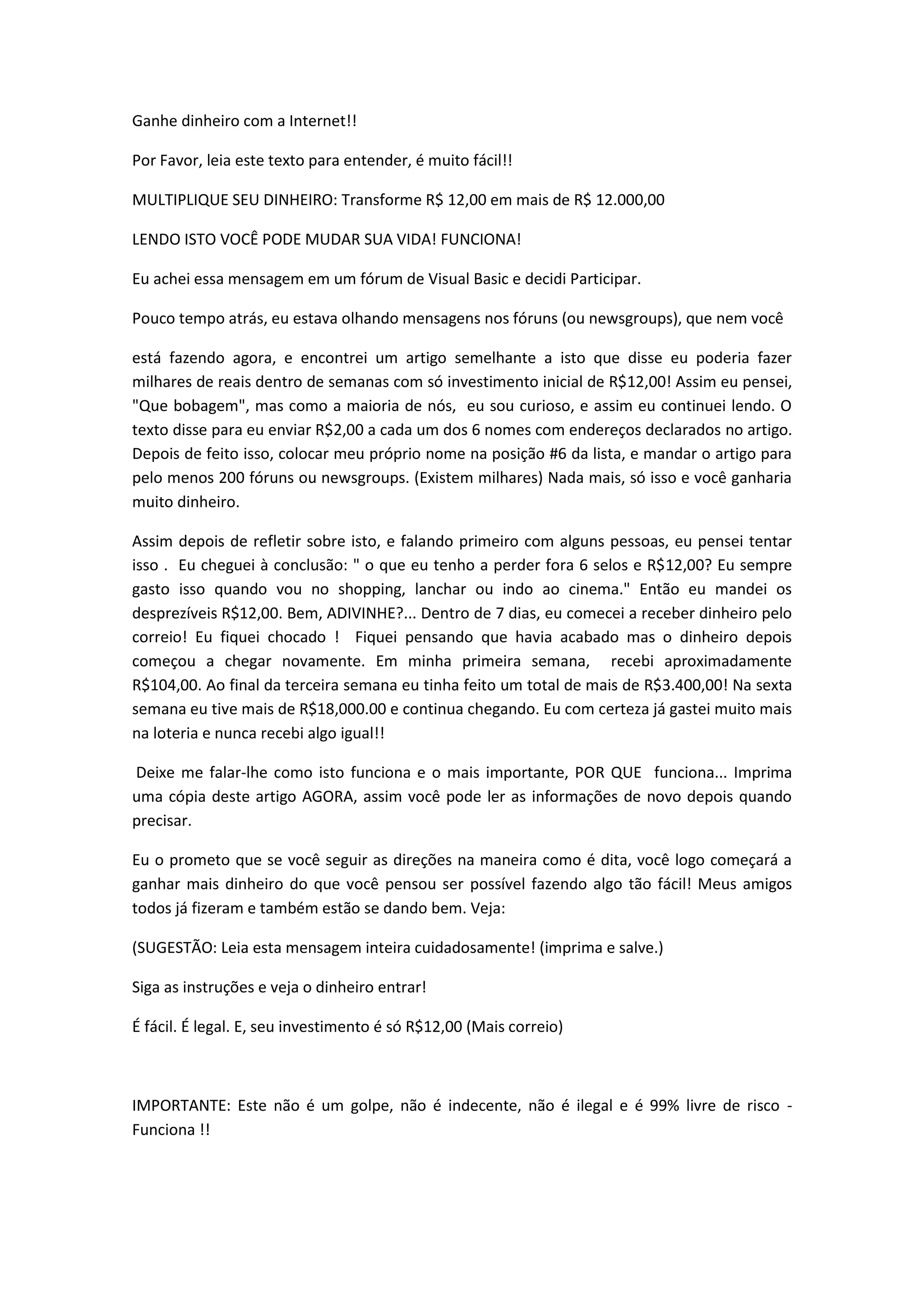 [1] O documento propõe um esquema em que, enviando R$12 para 6 pessoas listadas e postando o texto em 200 fóruns, a pessoa poderá ganhar milhares de reais em poucas semanas. [2] Alega que à medida que mais pessoas participam, o dinheiro enviado aumenta exponencialmente conforme a pessoa sobe na lista de remessas. [3] Na verdade, trata-se de um golpe em cadeia, pois depende do recrutamento contínuo de novos participantes para que os primeiros continuem receb