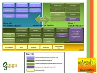 O documento discute a TV digital com Linux no Brasil. Explica como o sistema de TV digital funciona, as especificações técnicas do padrão ISDB-TB brasileiro e as implementações do middleware Ginga em Linux, incluindo Ginga-NCL e Ginga-J.
