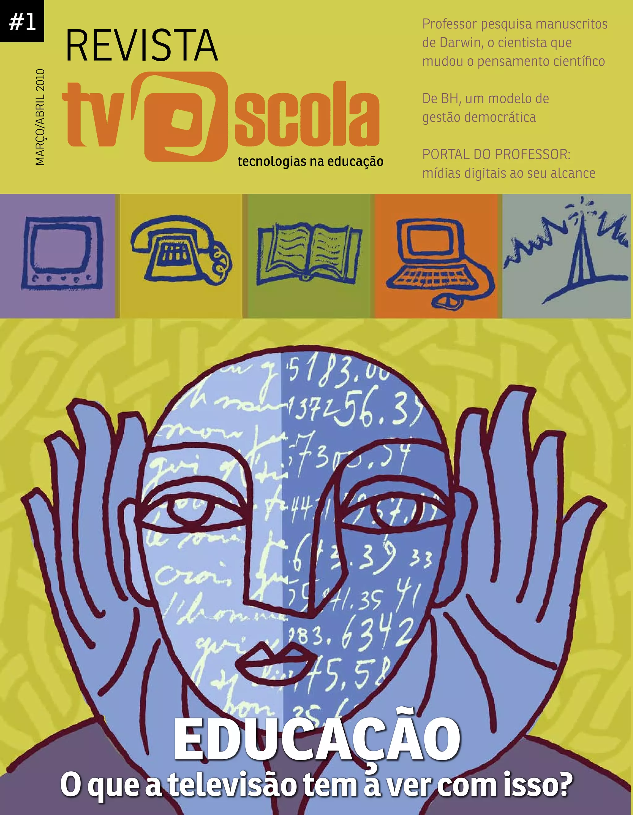 2) A revista apresenta reportagens sobre tecnologias na educação, uma entrevista com Nélio Bizzo sobre Darwin e casos de boas práticas pedagógicas.