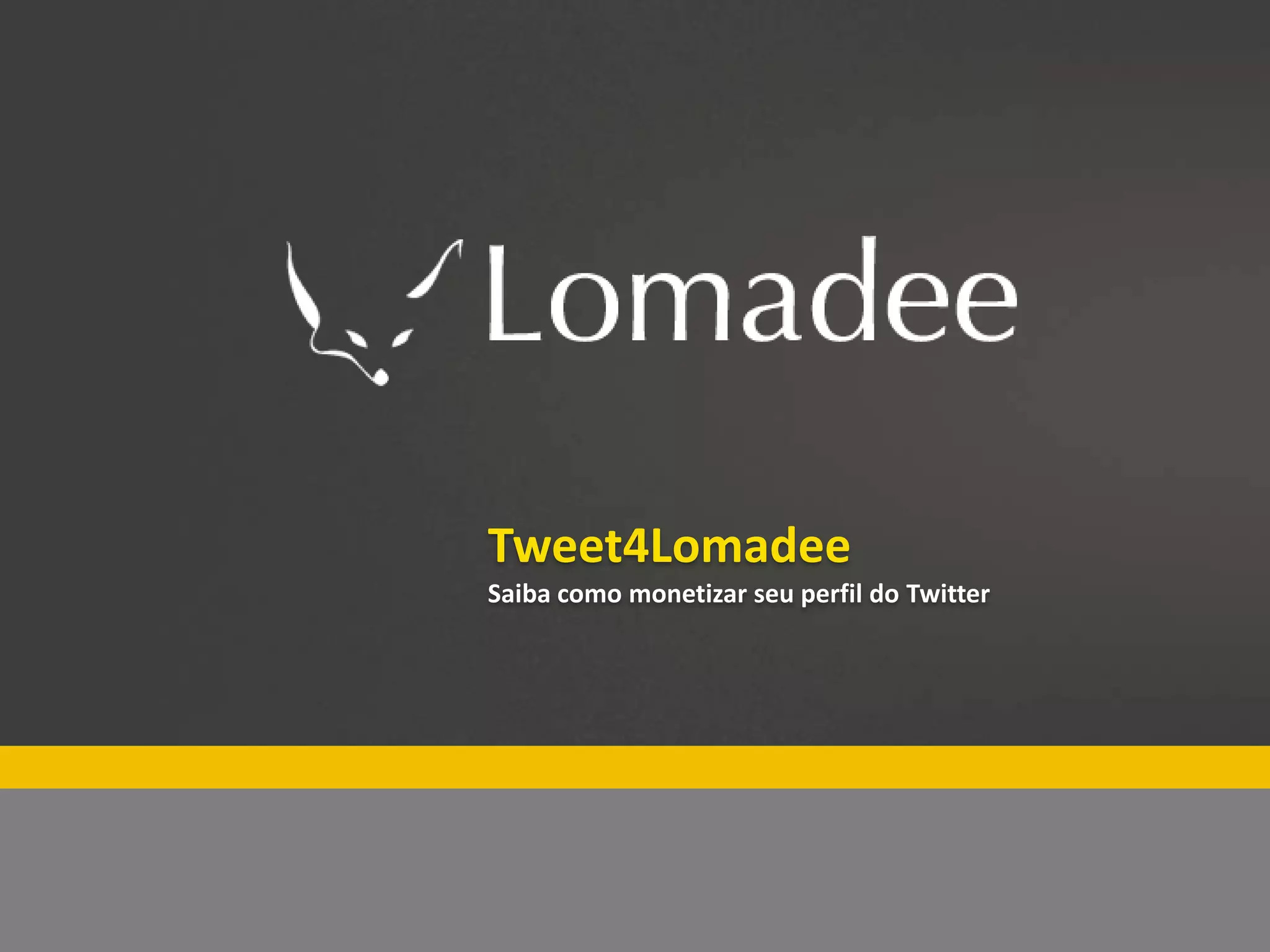 O documento descreve como usuários podem monetizar seus perfis no Twitter usando o aplicativo Tweet4Lomadee da plataforma Lomadee, listando os 9 passos para cadastrar o perfil no aplicativo e começar a receber pagamentos por tweets automatizados.
