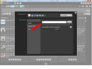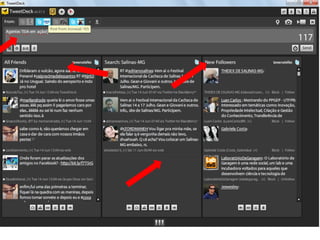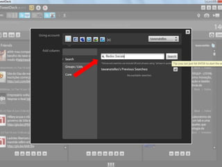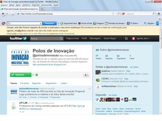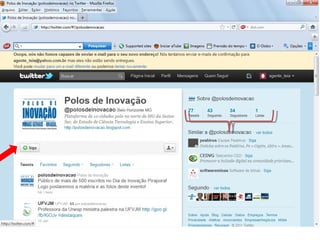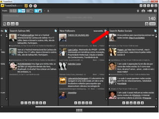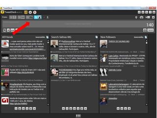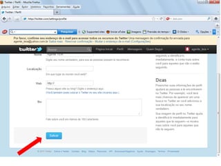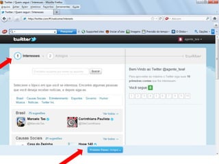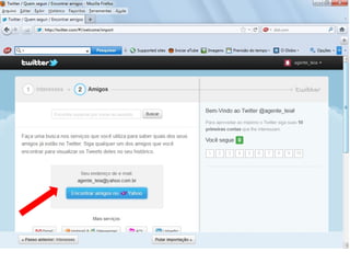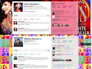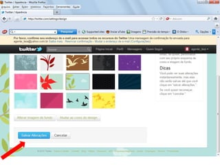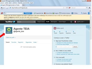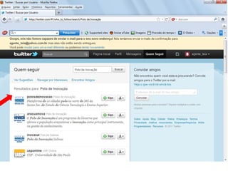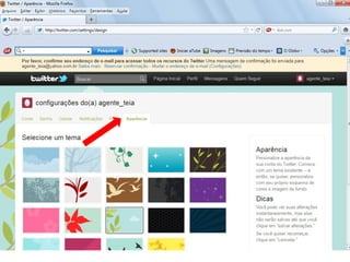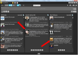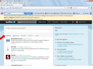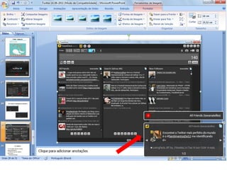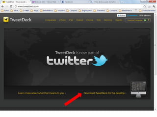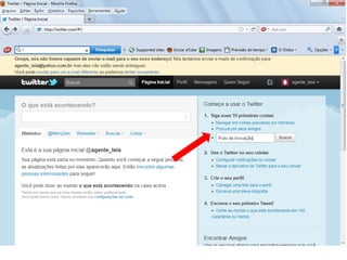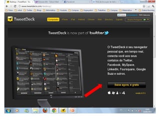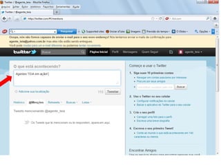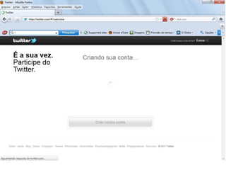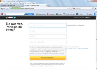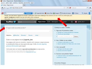 O documento resume as principais características e recursos do Twitter. Ele explica que o Twitter foi lançado em 2006 com a ideia de permitir que as pessoas fossem mais espontâneas com poucos caracteres, e que ganhou popularidade entre 2009 e 2011. Também lista alguns recursos comuns do Twitter como @, #, RT e links curtos.
