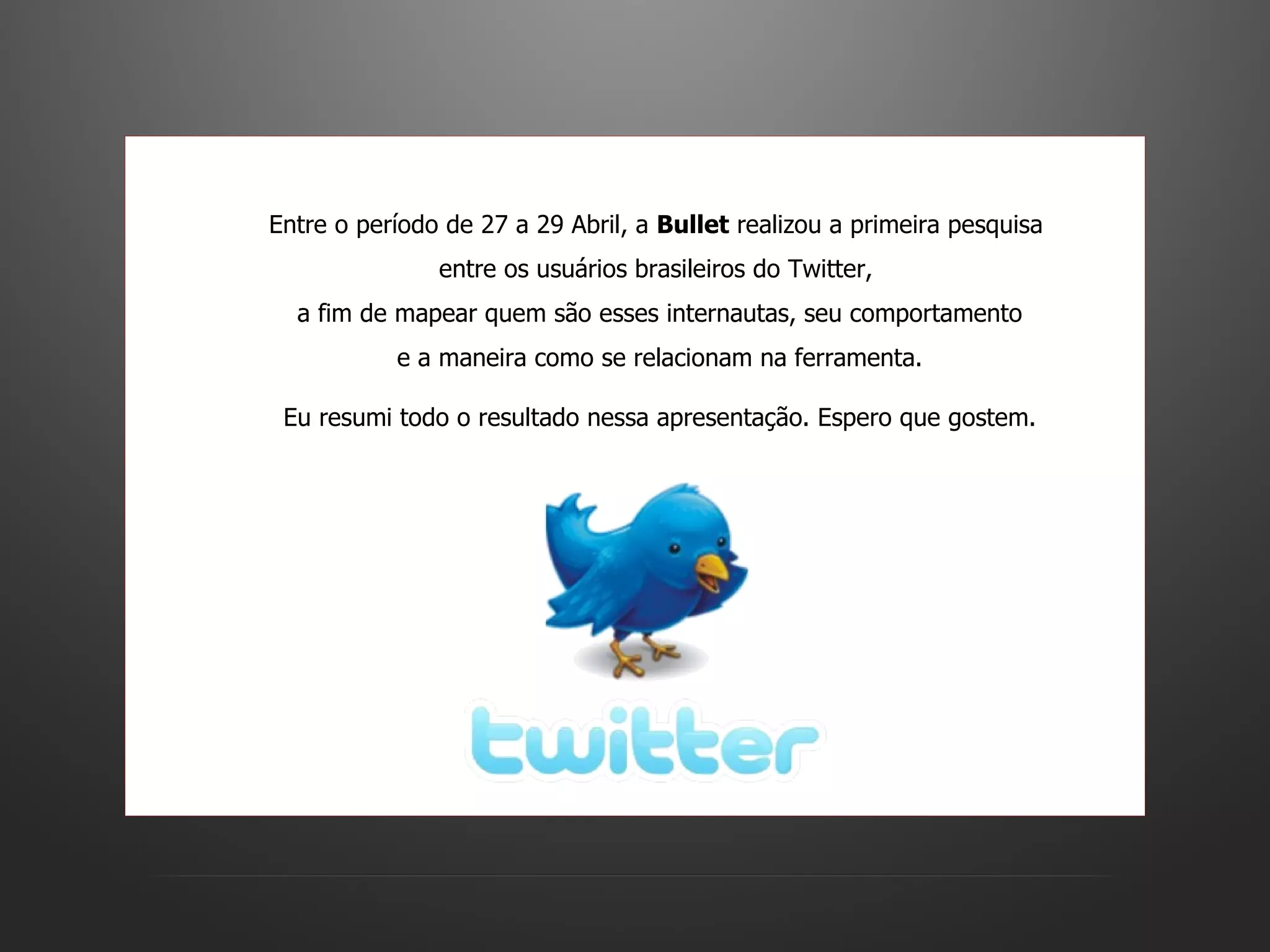 O documento apresenta os resultados de uma pesquisa realizada no Twitter entre usuários brasileiros, mostrando que a maioria é de homens jovens solteiros de São Paulo, estudantes ou graduados, que passam quase 50 horas por semana online e usam diversas redes sociais. Eles usam o Twitter principalmente para acompanhar discussões e compartilhar informações.