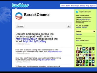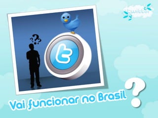 O documento discute o uso crescente do Twitter como ferramenta de marketing político no Brasil. A maioria dos usuários brasileiros do Twitter são homens entre 21-30 anos. Cerca de 70% seguem perfis de empresas e campanhas políticas no Twitter. Muitos políticos brasileiros agora usam o Twitter como estratégia de marketing para as eleições de 2010, seguindo o exemplo da campanha presidencial vitoriosa de Barack Obama em 2008 que fez amplo uso das mídias sociais.