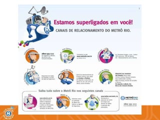 Pesquisa IBOPE realizadaem Fevereiro de 2010 Pergunta : Acabou a transferência no Estácio. Agora, os clientes da Linha 2 vão da Pavuna até Botafogo sem trocar de trem. O(a) sr(a) diria que esta mudança foi: Critério Econôm. Brasil Linha Estações da Linha 1 Estações da Linha 2 Total Classe A Classe B Classe C/D 1 2 SPN/ ESA POZ/ CNL GLR/ CAV SC/ IGO PVN/ IRJ VCV/ SCR Base: Amostra (1001) (109) (477) (415) (763) (238) (126) (308) (210) (119) (140) (98) Muito positiva 12 14 12 11 11 15 6 9 15 13 13 17 Positiva 43 30 42 47 42 44 37 47 46 32 46 40 Não teve impacto 12 11 12 11 13 7 13 12 12 18 6 8 Negativa 23 26 24 22 23 24 29 23 19 25 24 24 Muito negativa 7 15 7 6 7 8 13 6 6 8 7 8 NS/NR 3 5 3 3 3 3 3 3 3 4 3 2