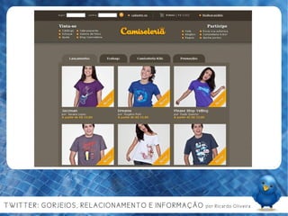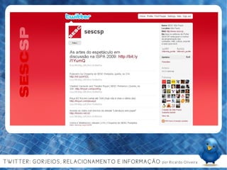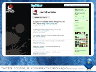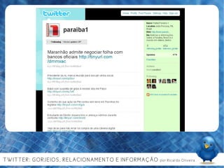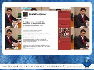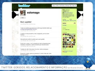 Ricardo Oliveira, um jovem de 23 anos, é um comunicólogo e crítico de cinema, que explora a evolução e o impacto das redes sociais, especialmente o Twitter, na comunicação e na interação social. O documento discute a importância de conteúdo gerado pelo usuário, a colaboração e as ferramentas de auto-organização nas mídias sociais, além de sugerir usos práticos do Twitter para marcas e indivíduos. Finaliza com a reflexão sobre a necessidade de utilidade e relevância nas interações digitais para manter a atenção do público.