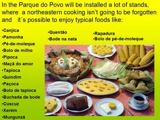 O documento convida as pessoas a virem para Campina Grande, na Paraíba, para experimentarem as deliciosas comidas típicas da maior festa de São João. Ele explica as estruturas gramaticais usadas no convite, como futuro com "going to", futuro simples, modo imperativo, conjunção "and" e grupo nominal.