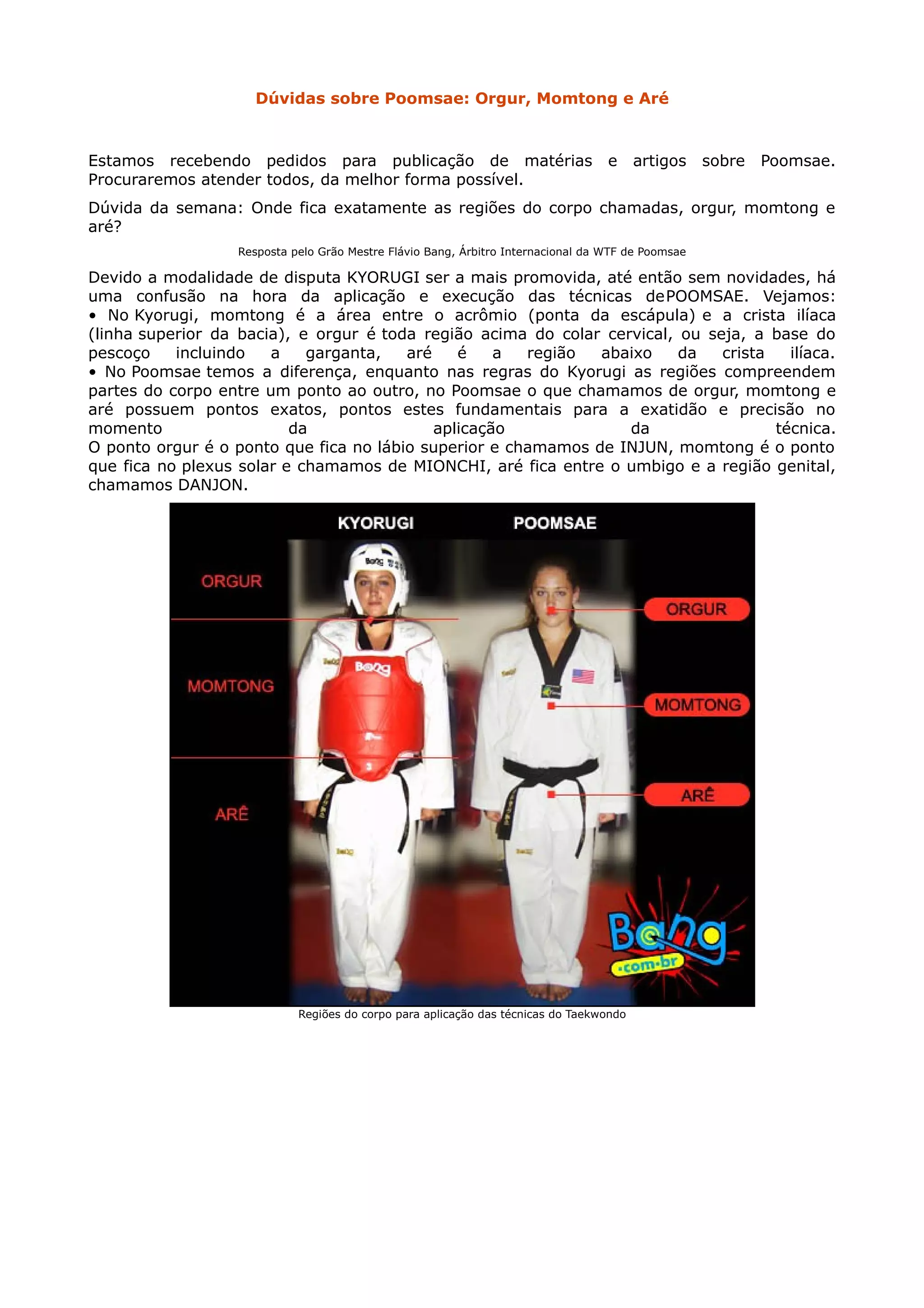 No Poomsae, orgur refere-se ao lábio superior (Injun), momtong ao plexo solar (Mionchi) e aré entre o umbigo e região genital (Danjon). Estas são regiões específicas do corpo usadas para aplicar técnicas com precisão, diferentemente do Kyorugi que define estas áreas entre pontos do corpo.