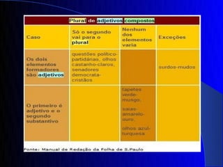 O documento discute as regras para a formação do plural em substantivos, adjetivos e adjetivos de origem (gentílicos) compostos em português. Explica que em substantivos compostos todos os elementos variáveis são flexionados, enquanto em adjetivos compostos apenas o último elemento é flexionado. Também discute exceções como adjetivos compostos de cores e origem.