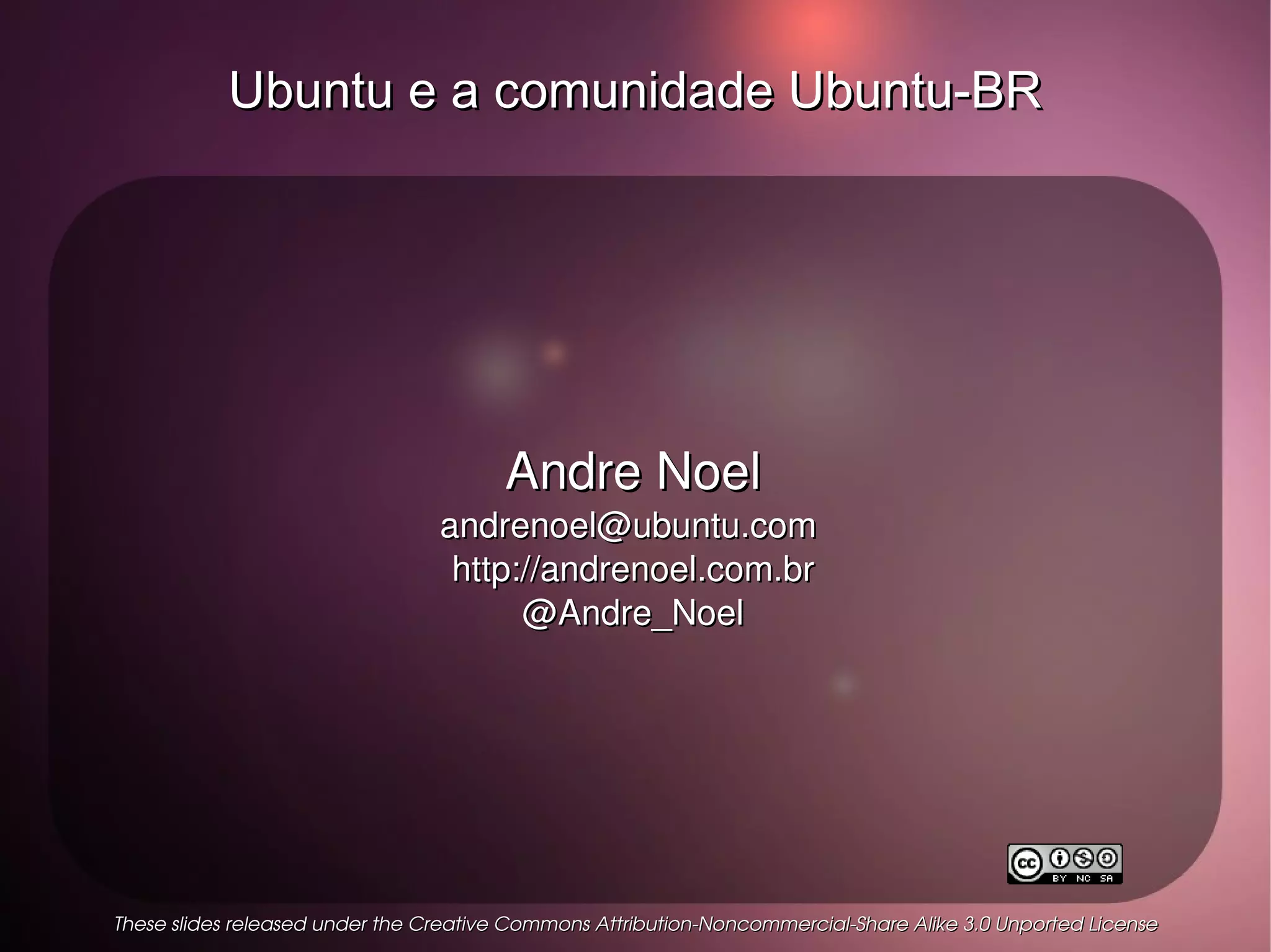 Este documento apresenta o Ubuntu e a comunidade Ubuntu-BR. Resume as principais versões do Ubuntu, como obter ajuda e como contribuir. Apresenta Andre Noel, membro fundador da comunidade Ubuntu-BR, e explica que o Ubuntu é um sistema operacional livre baseado em Linux desenvolvido por uma grande comunidade global.