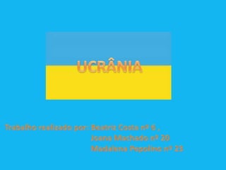 O documento fornece um resumo da Ucrânia em 7 seções: 1) O país, descrevendo sua história; 2) Geografia, detalhando seu tamanho e paisagem; 3) Cultura, incluindo artesanato e ovos pintados; 4) Danças, focando nos cossacos; 5) Música, com instrumentos como a bandura; 6) Pratos típicos como varenyky e frango de Kiev; e 7) Imagens ilustrativas do país.