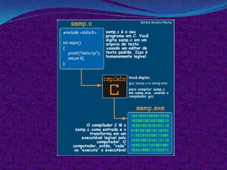 O documento resume as principais características da linguagem de programação C, incluindo sua estrutura, sintaxe, bibliotecas, funções e palavras reservadas. É definida como uma linguagem de propósito geral projetada para programação estruturada que possui facilidade de uso e geração de código eficiente.