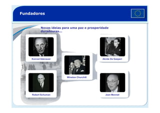 O documento fornece um resumo abrangente da União Europeia, incluindo sua história, membros, instituições, economia, moeda, mercado único, políticas e desafios. A UE é composta por 27 países e 500 milhões de pessoas e promove a paz, prosperidade e cooperação entre seus membros.
