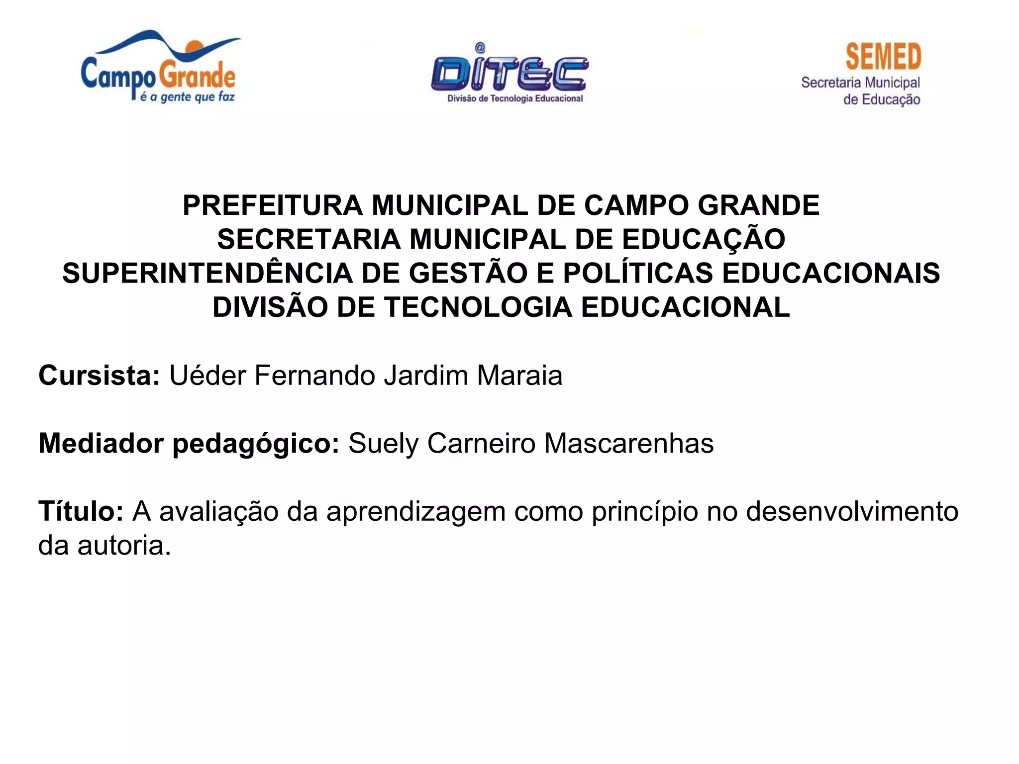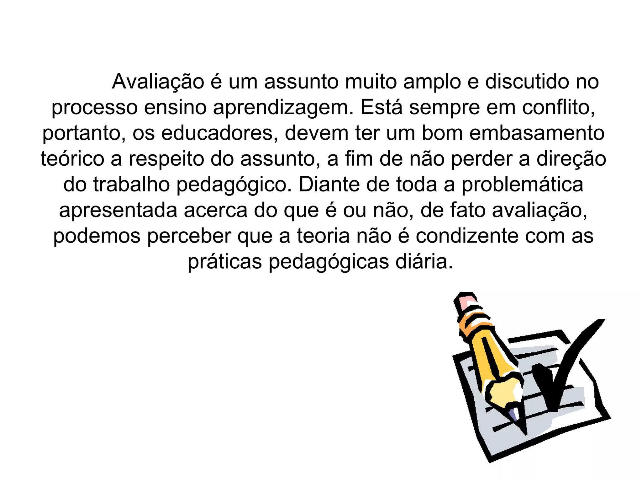 Este documento discute a avaliação da aprendizagem como princípio no desenvolvimento da autoria. A avaliação deve levar em conta múltiplos fatores para fornecer interpretações mais completas da realidade do aluno. Uma avaliação de acompanhamento que descreve, qualifica e permite intervenção é mais abrangente do que apenas certificar o produto final. Os professores devem utilizar diversos instrumentos de avaliação para apoiar o processo de ensino-aprendizagem.