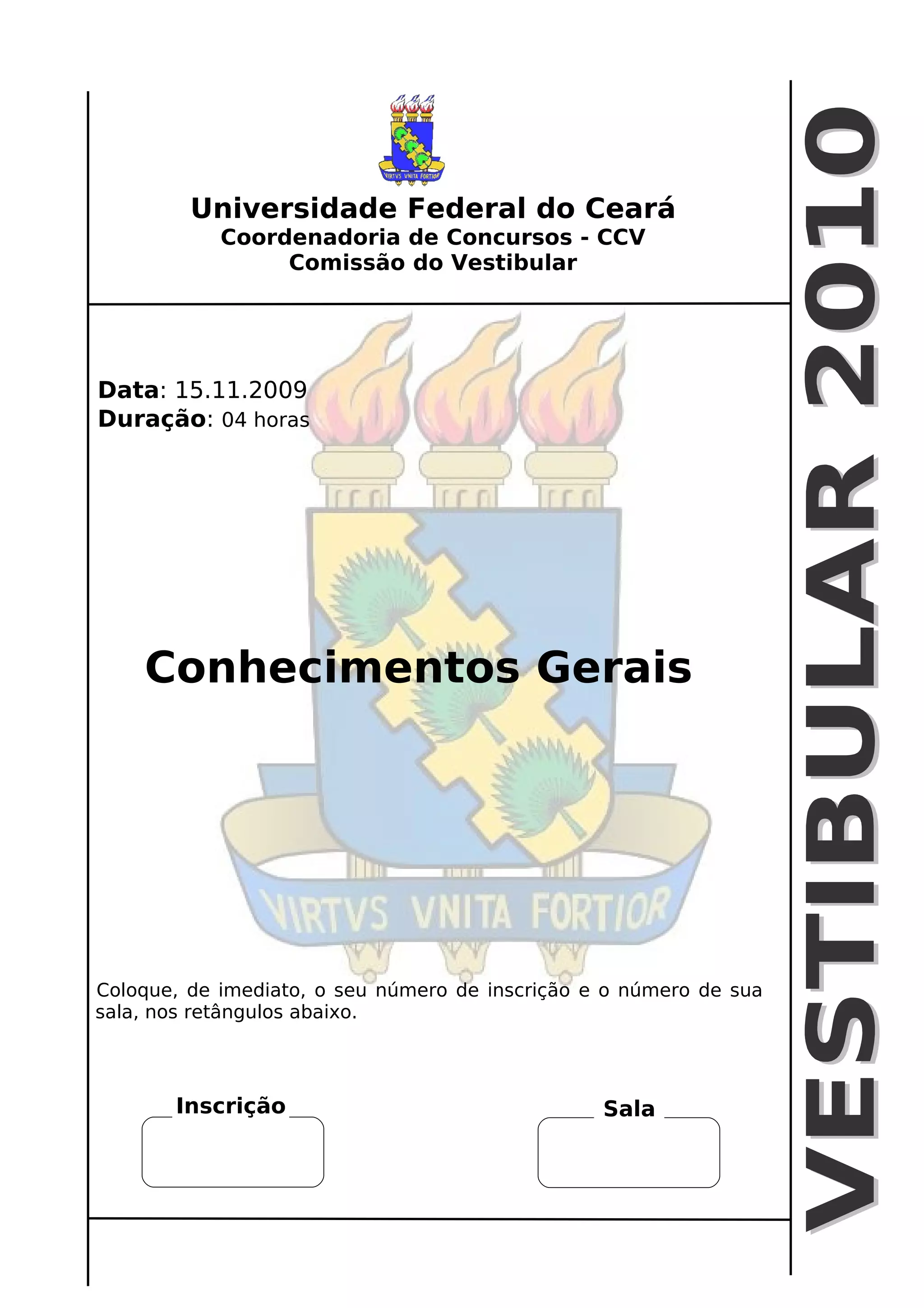 O documento apresenta informações sobre um vestibular da Universidade Federal do Ceará, incluindo a data de realização, duração e disciplinas cobradas. Há também instruções sobre preenchimento de dados e uma tabela periódica dos elementos.