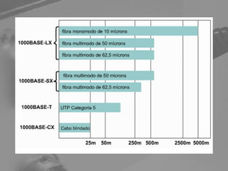 Gigabit Ethernet é uma tecnologia de rede que permite velocidades de transmissão de dados de até 1 gigabit por segundo, evoluindo as tecnologias Ethernet e Fast Ethernet. Existem quatro padrões principais que utilizam diferentes tipos de cabos como fibra óptica ou cabos de cobre. A Gigabit Ethernet é usada principalmente para ligar equipamentos de rede e estações de trabalho de alto desempenho.