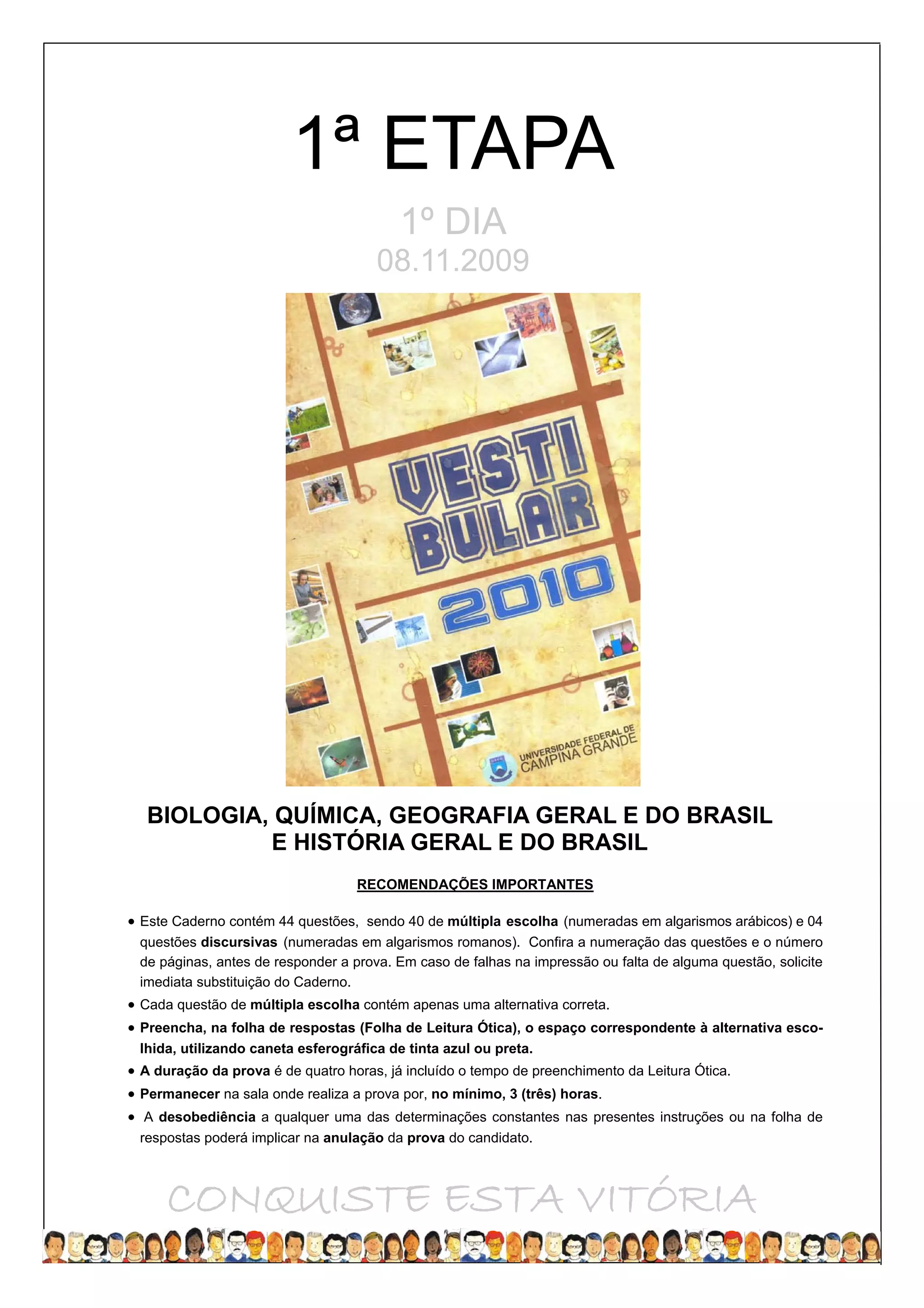 1) O documento apresenta instruções e recomendações para a realização de uma prova de vestibular com questões de Biologia, Química, Geografia e História.