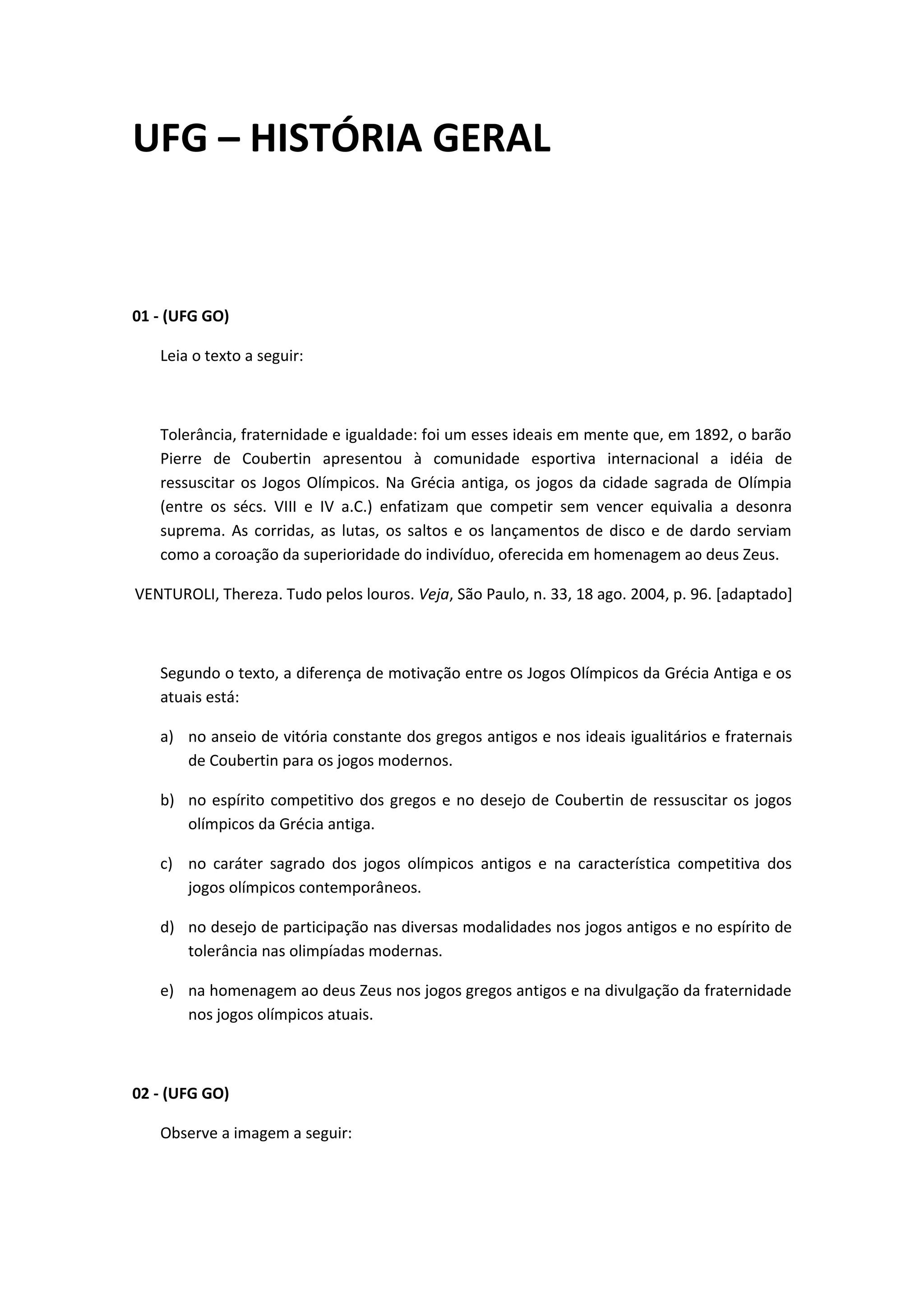 1) A diferença entre os Jogos Olímpicos da Grécia Antiga e os atuais está no anseio de vitória constante dos gregos antigos e nos ideais igualitários e fraternais de Coubertin para os jogos modernos.